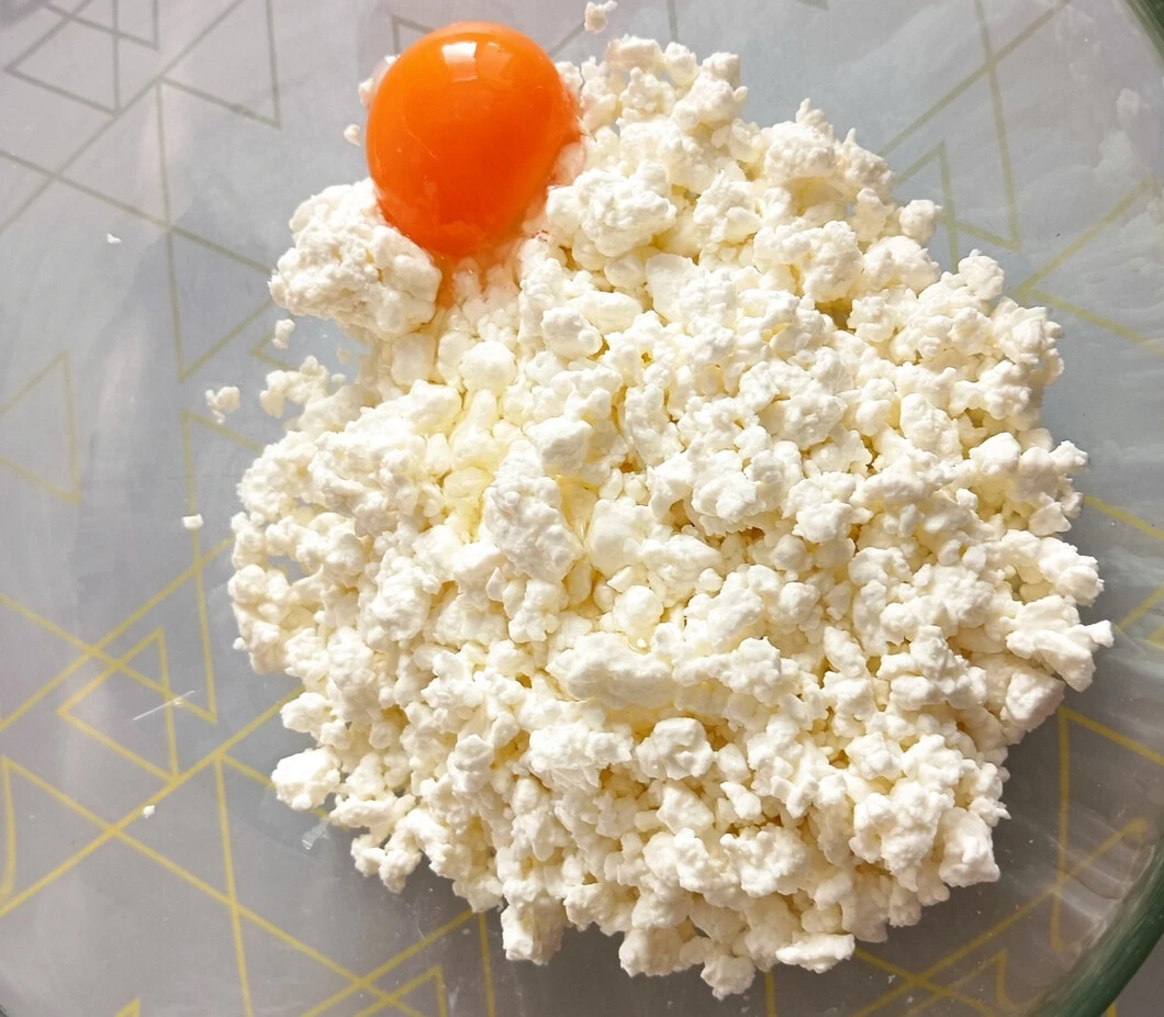 Выложите творог в миску, посолите, добавьте яйцо и хорошо перемешайте. Можно добавить сметану, если смесь будет суховата.