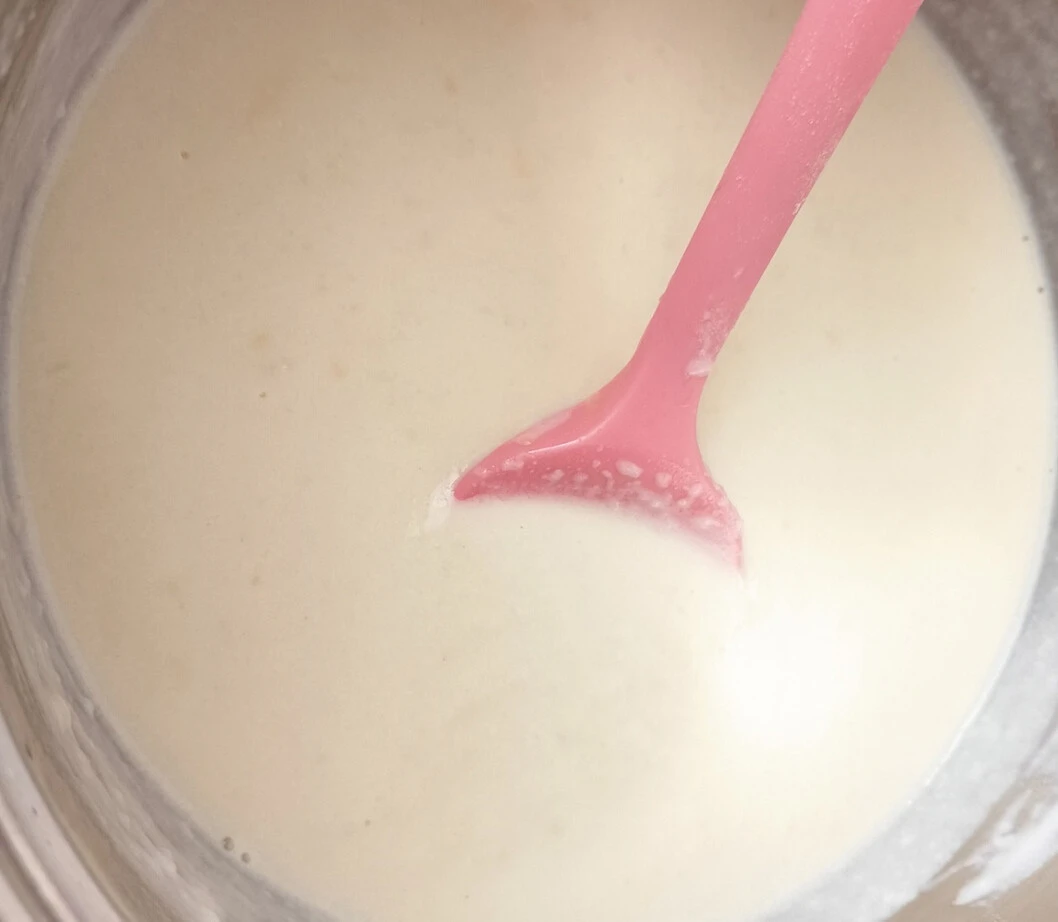 Порциями влейте в творожную массу тёплое молоко, постоянно вымешивая до однородности. В конце влейте сливки и посолите по вкусу.