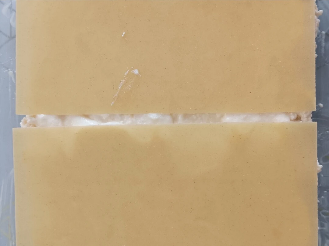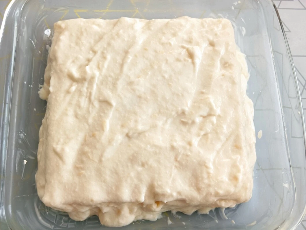 Выложите второй слой листов лазаньи, меняя их направление относительно предыдущего слоя. Слегка полейте соусом поверхность. Выложите оставшийся творог, чуть полейте соусом. Накройте последним слоем листов лазаньи, меняя их направление относительно предыдущего слоя.