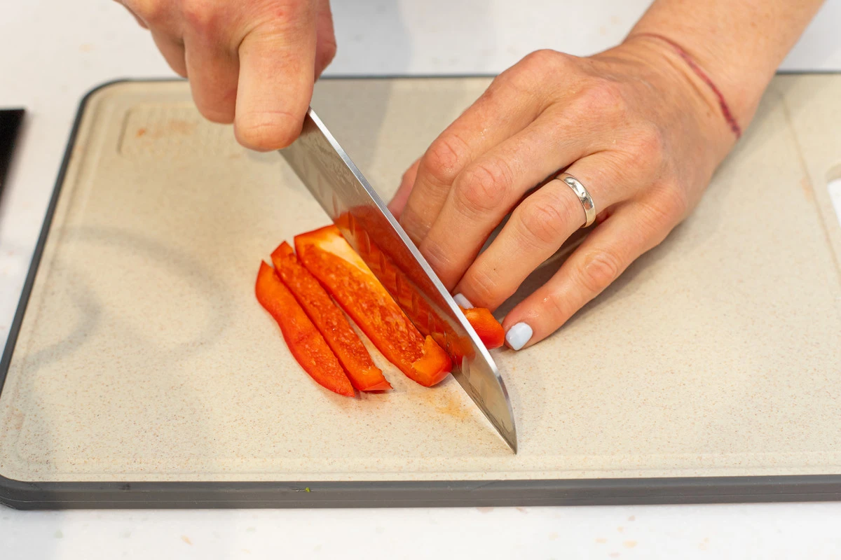 Сладкий перец нарежьте полосками, удалив семена, и сложите в кастрюлю.