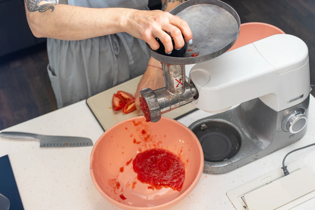Попустите помидоры через мясорубку или пробейте в блендере до однородной массы, добавьте соль, сахар и растительное масло.
