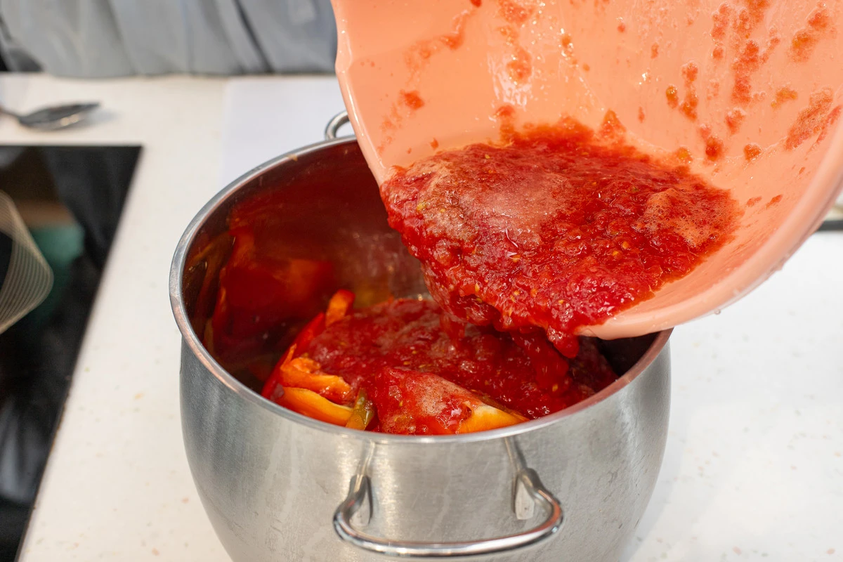 Влейте томатный соус к перцу, доведите до кипения и варите около 30 минут всё вместе при несильном кипении.