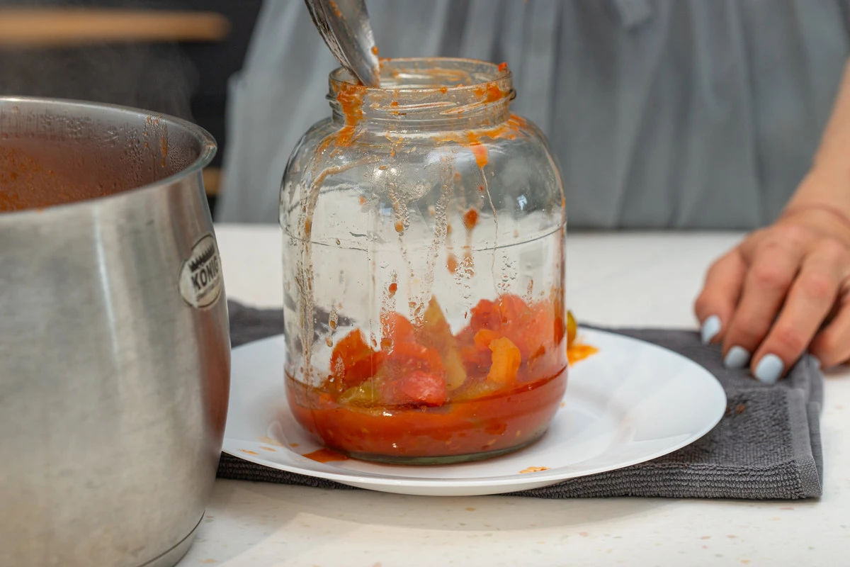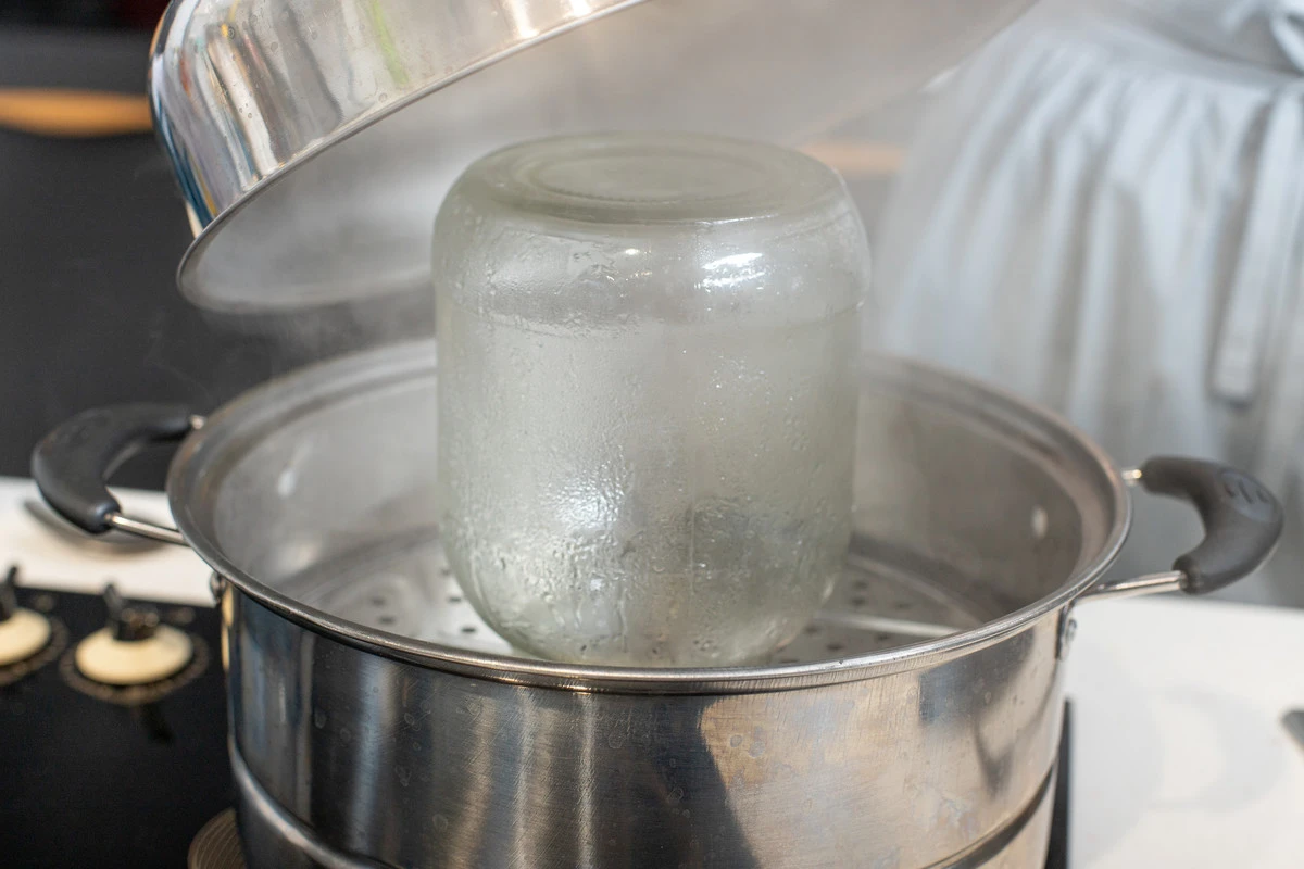 Простерилизуйте банки и крышки: банки удобно стерилизовать над паром или в духовке, а крышки — в кипящей воде.
