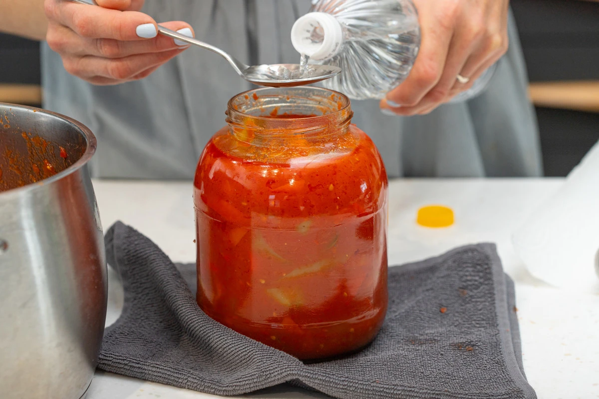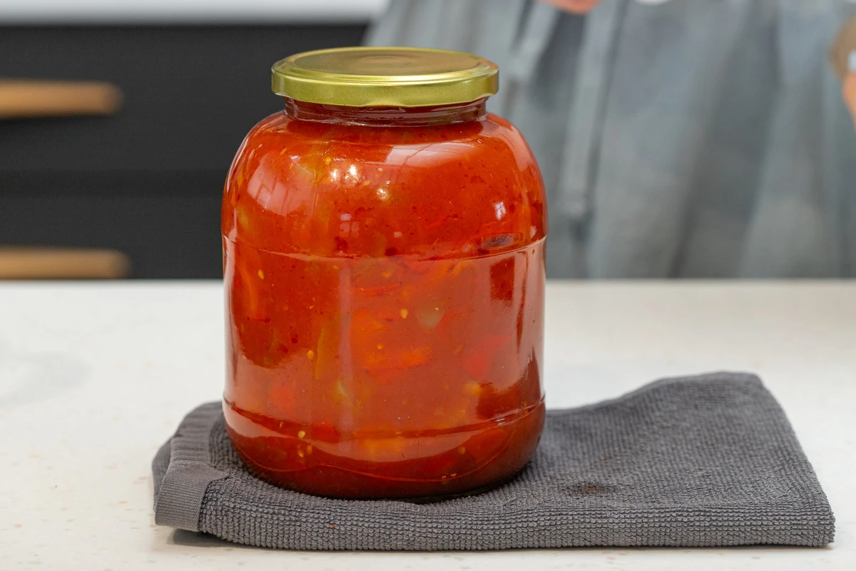 Влейте в каждую банку уксус из расчёта 20 мл на литр лечо, закатайте или завинтите крышки горячими.