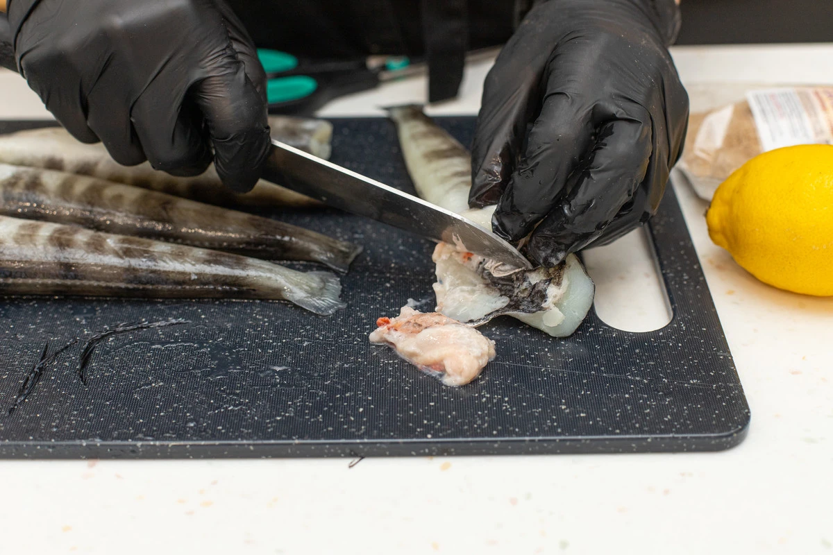 Аккуратно отрежьте острые плавники, удалите голову вместе с жабрами. Рыбу промойте и обсушите, натрите солью.