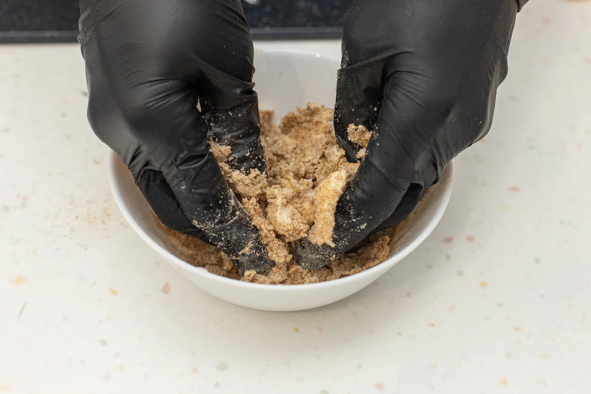 Панировочные сухари насыпьте в мисочку, выдавите сок из половинки лимона, добавьте щепотку соли и натрите чеснок. Добавьте мягкое сливочное масло и размешайте руками или вилкой.