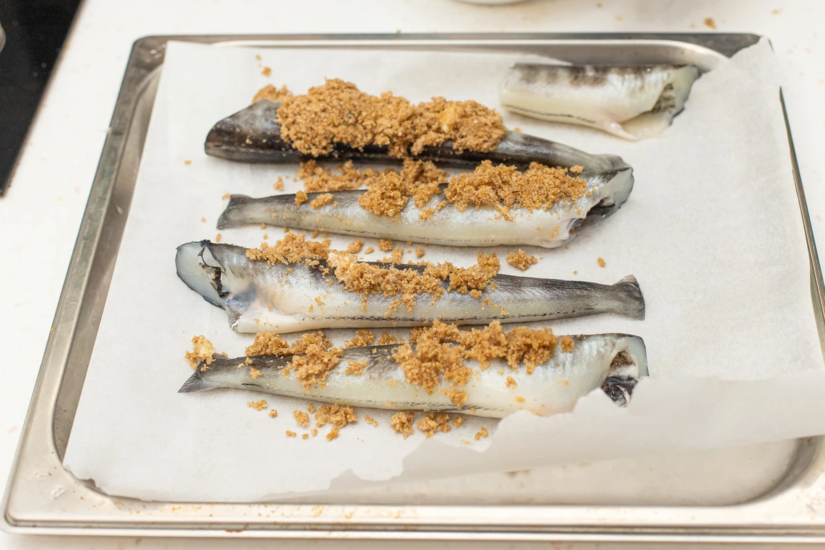 Противень застелите пергаментом, выложите тушки рыбы. Сверху разложите крошку из сухарей. Поставьте противень с рыбой в разогретую до 190 °C духовку и запекайте около 20 минут.