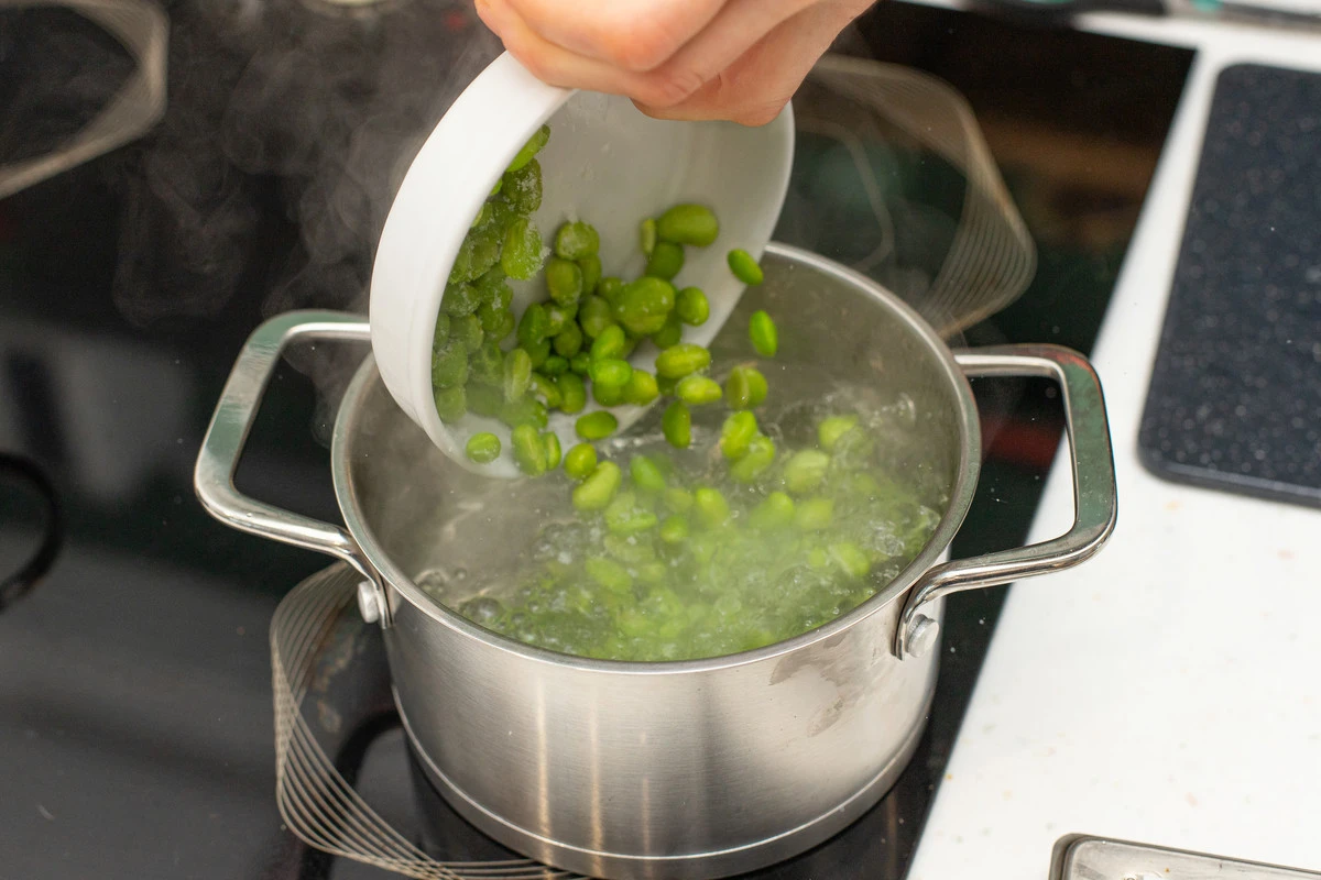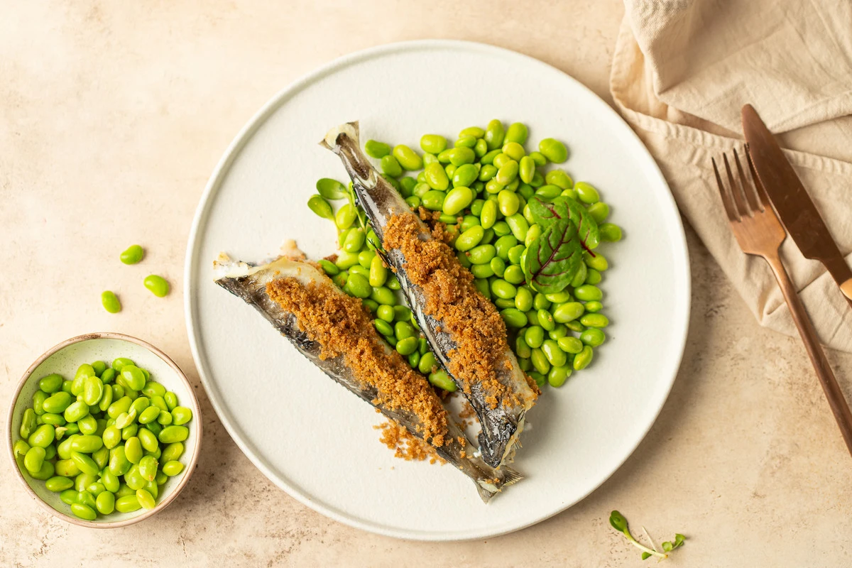 Пока рыба готовится, вскипятите воду в кастрюле и всыпьте эдамаме. Бланшируйте бобы 3-4 минуты, затем слейте воду и заправьте их небольшим количеством сливочного масла, добавьте рубленую петрушку и перемешайте.