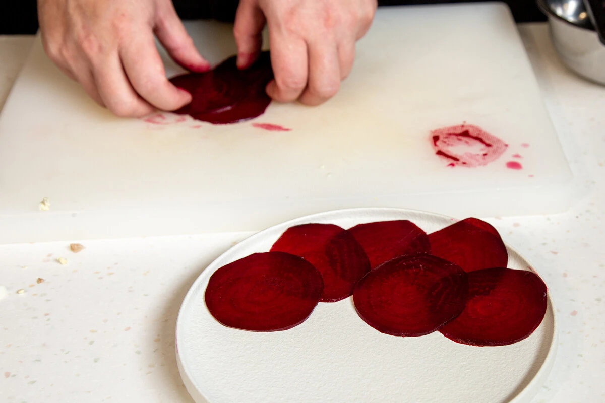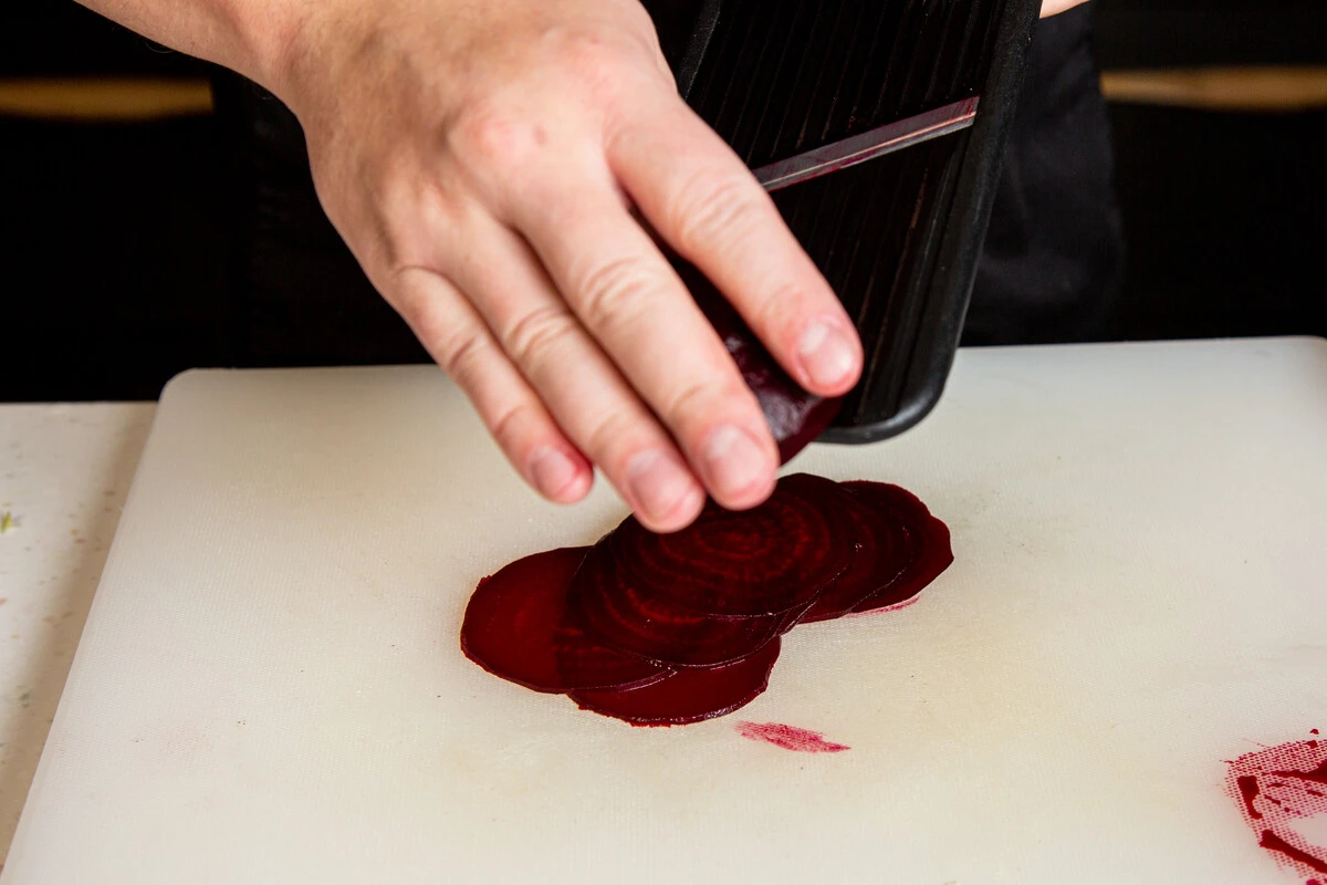 Свеклу очистите от кожицы и нарежьте тоненькими кружками.