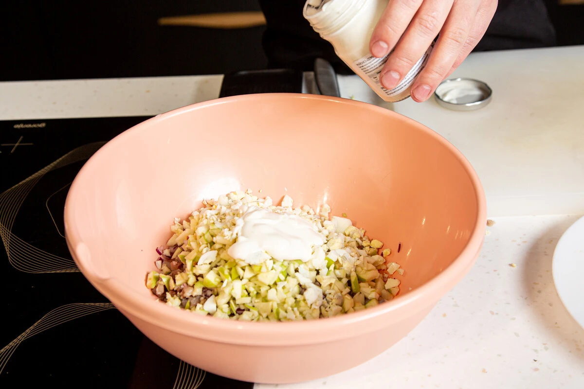 Филе сельди очистите от косточек и нарежьте кубиками, смешайте с нарезанным такими же кубиками яблоком и майонезом.