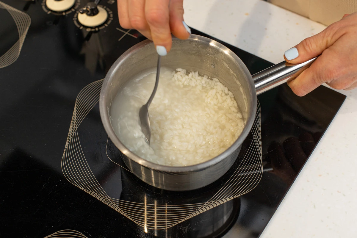 Добавьте наполовину готовый рис и смешайте все ингредиенты.