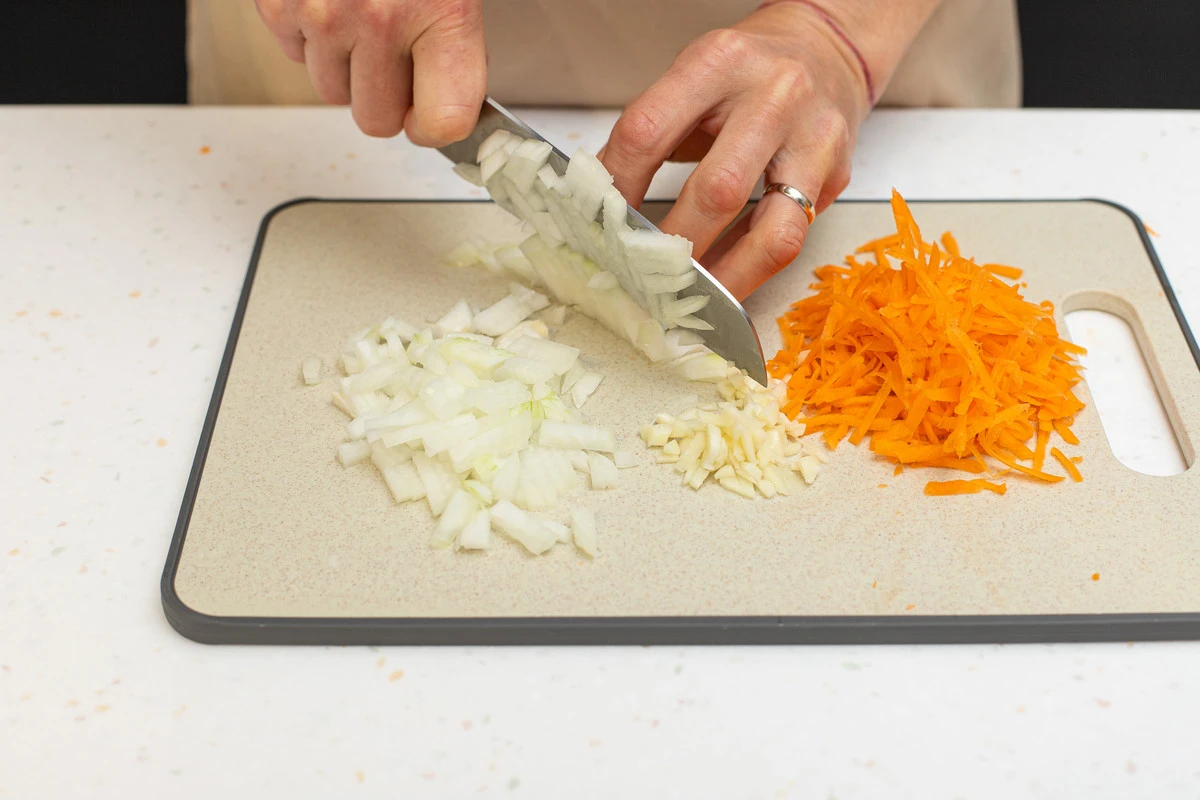 Пока он варится, лук нарежьте мелкими кубиками, чеснок измельчите, морковь натрите на тёрке.