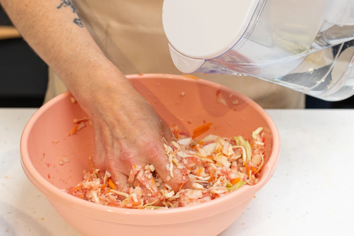 Добавьте в фарш капусту, влейте примерно полстакана воды и вымесите всё руками.