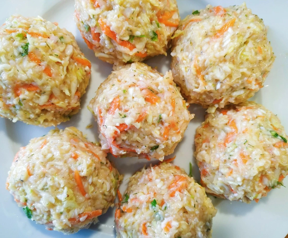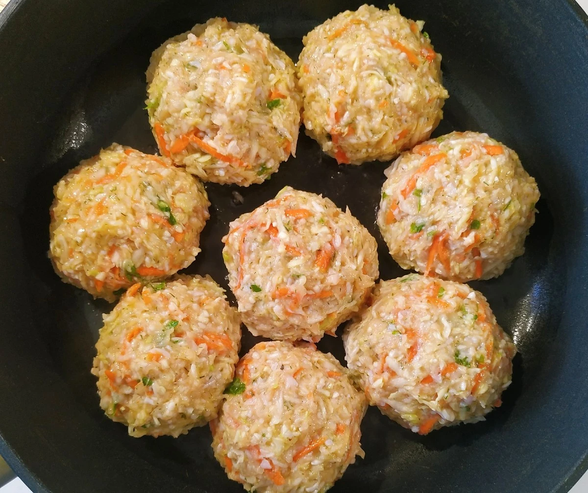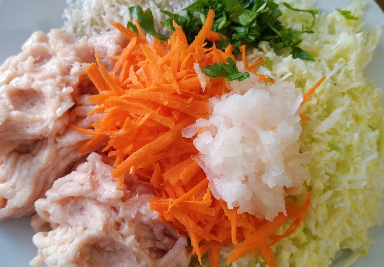 Фарш соедините с рисом и капустой. Добавьте половину моркови и лука, всё перемешайте. Посолите, поперчите и сформуйте голубцы-котлетки.