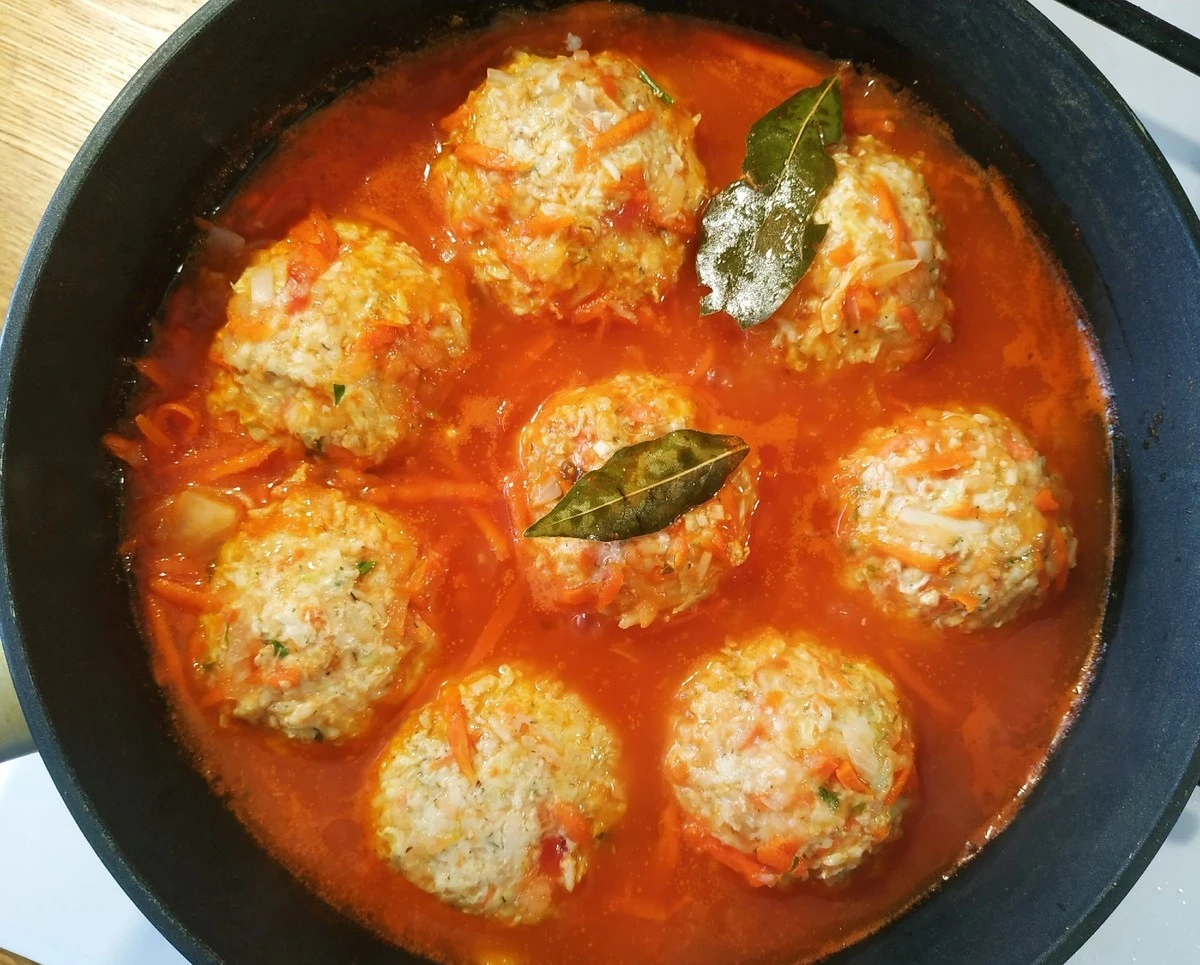 Приготовьте соус. К оставшимся моркови и луку добавьте томатную пасту и воду, посолите и поперчите.