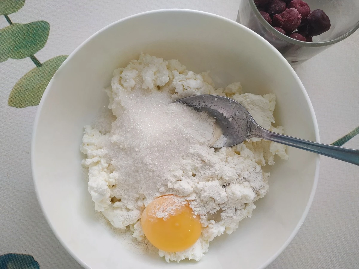 Соединяем творог, муку, желток, сахар и перемешиваем.