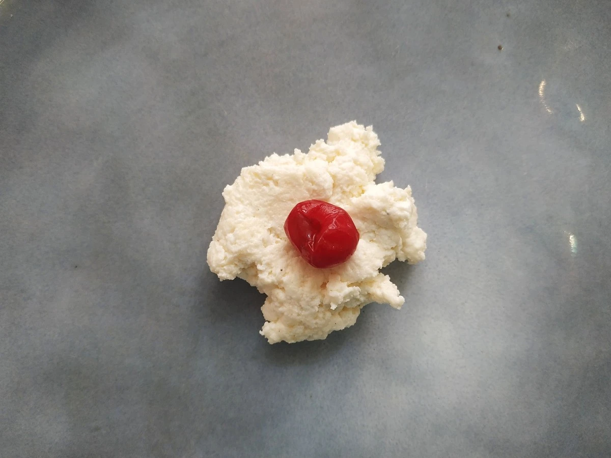 Отщипываем от творожного теста достаточное количество для одного шарика, в серединку кладём начинку.
