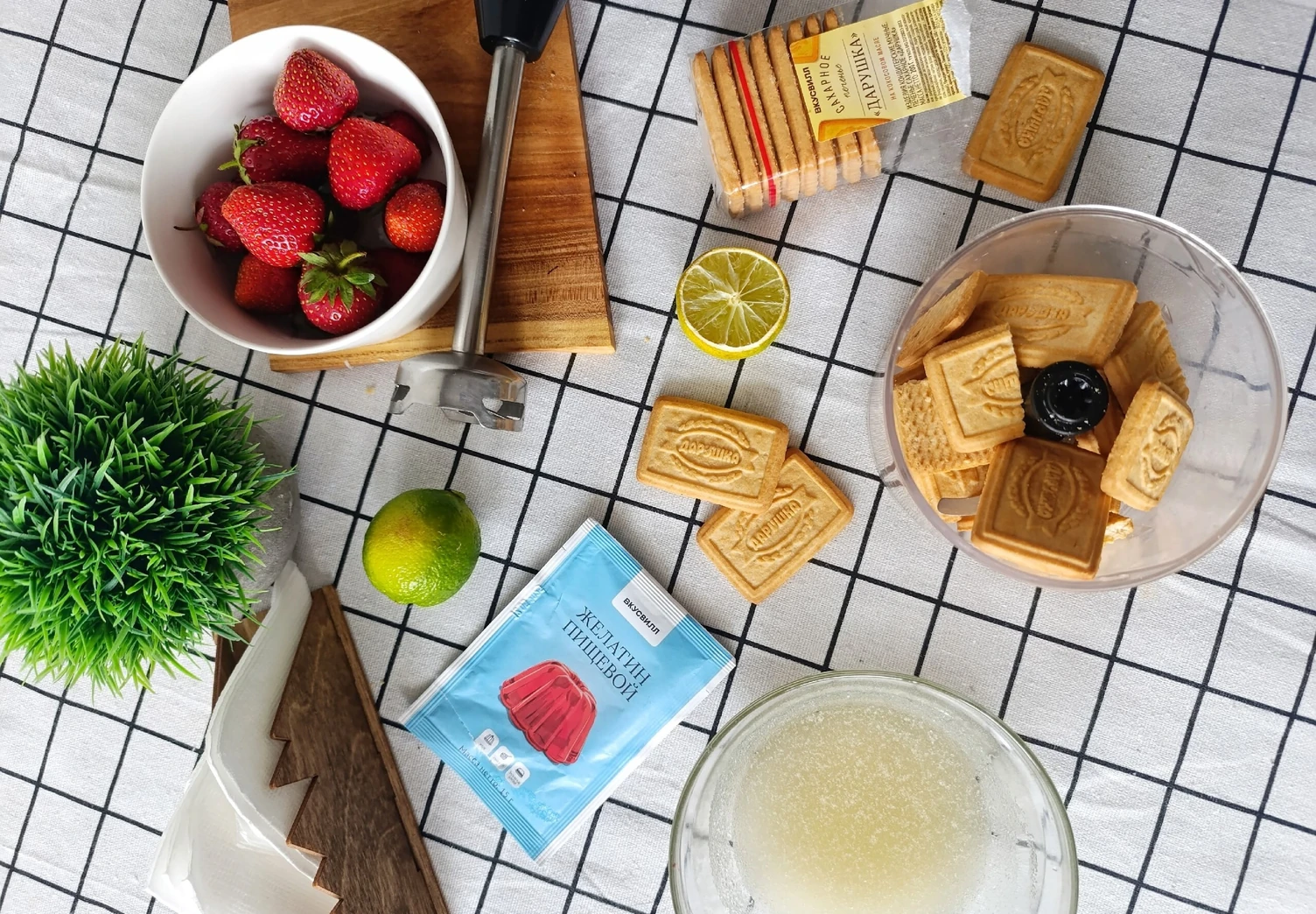 Измельчите печенье в крошку с помощью блендера. Растопите сливочное масло, смешайте с крошкой и сформируйте из получившейся массы основу в разъёмной форме. Уберите в холодильник.