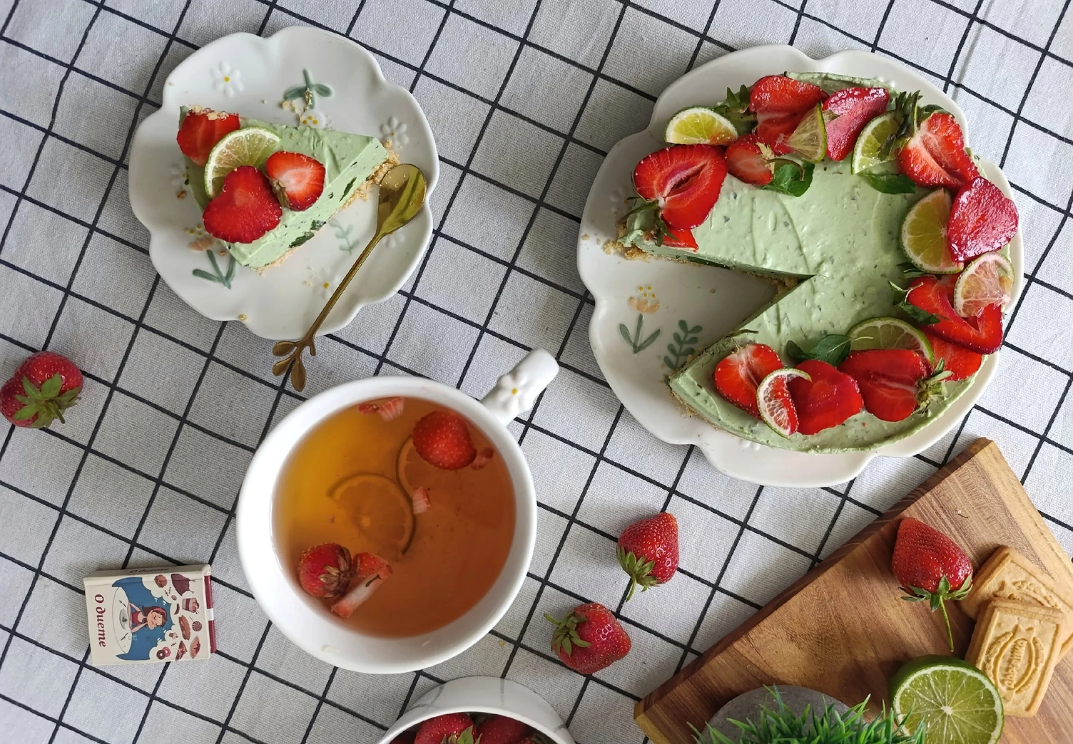 Украсьте чизкейк клубникой, лаймом и листочками мяты.