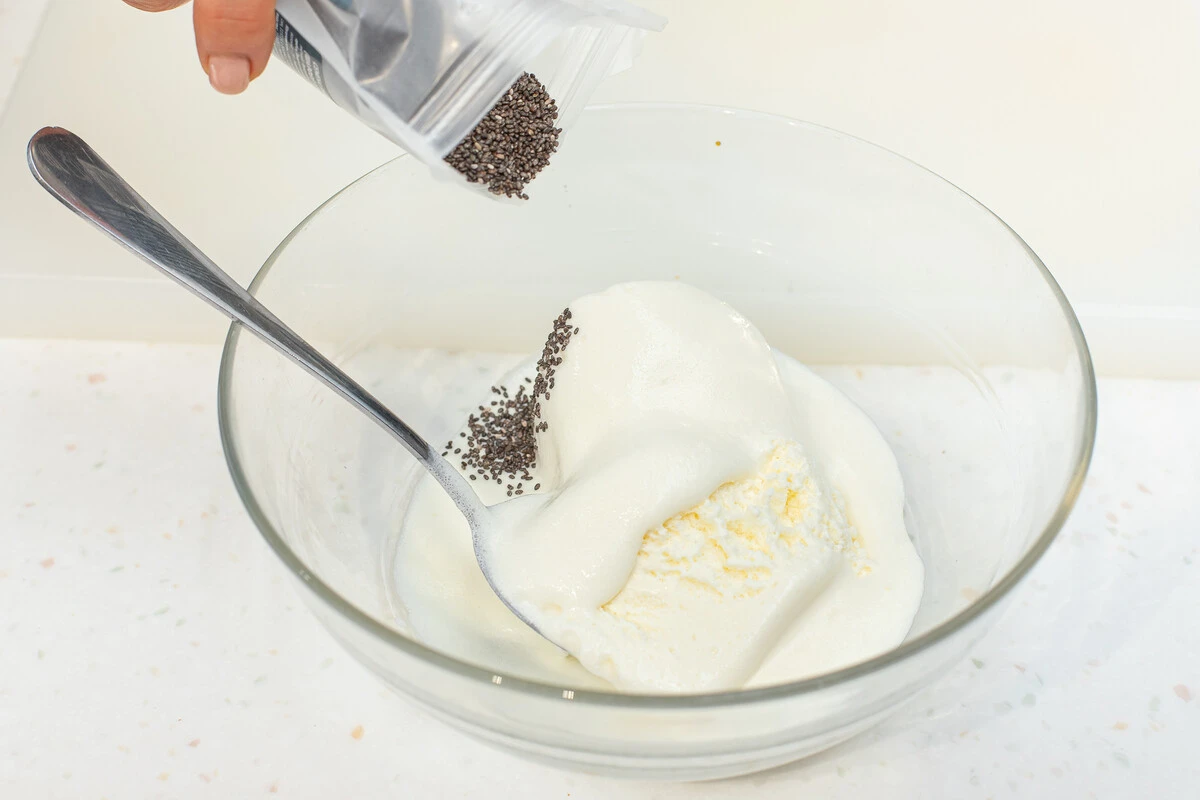 Достаньте мороженое из морозилки примерно минут за 10 до приготовления десерта, чтобы оно слегка подтаяло. Выложите в миску. Добавьте семена чиа и перемешайте.