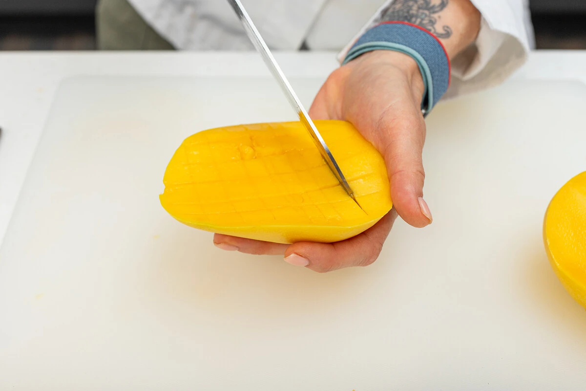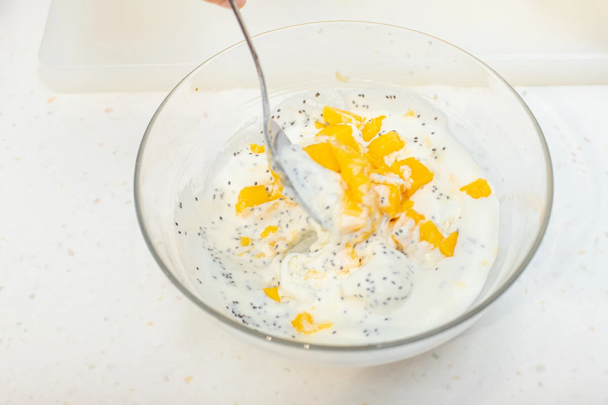 Добавьте кубики манго в мороженое с чиа. Перемешайте до соединения компонентов и уберите в морозилку примерно на час, чтобы масса немного подморозилась, но не совсем замёрзла.