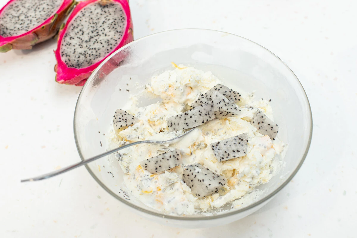 Питахайю разрежьте пополам, достаньте ложкой мякоть и нарежьте кубиками. Добавьте мякоть питахайи в подмороженную сливочно-фруктовую массу.