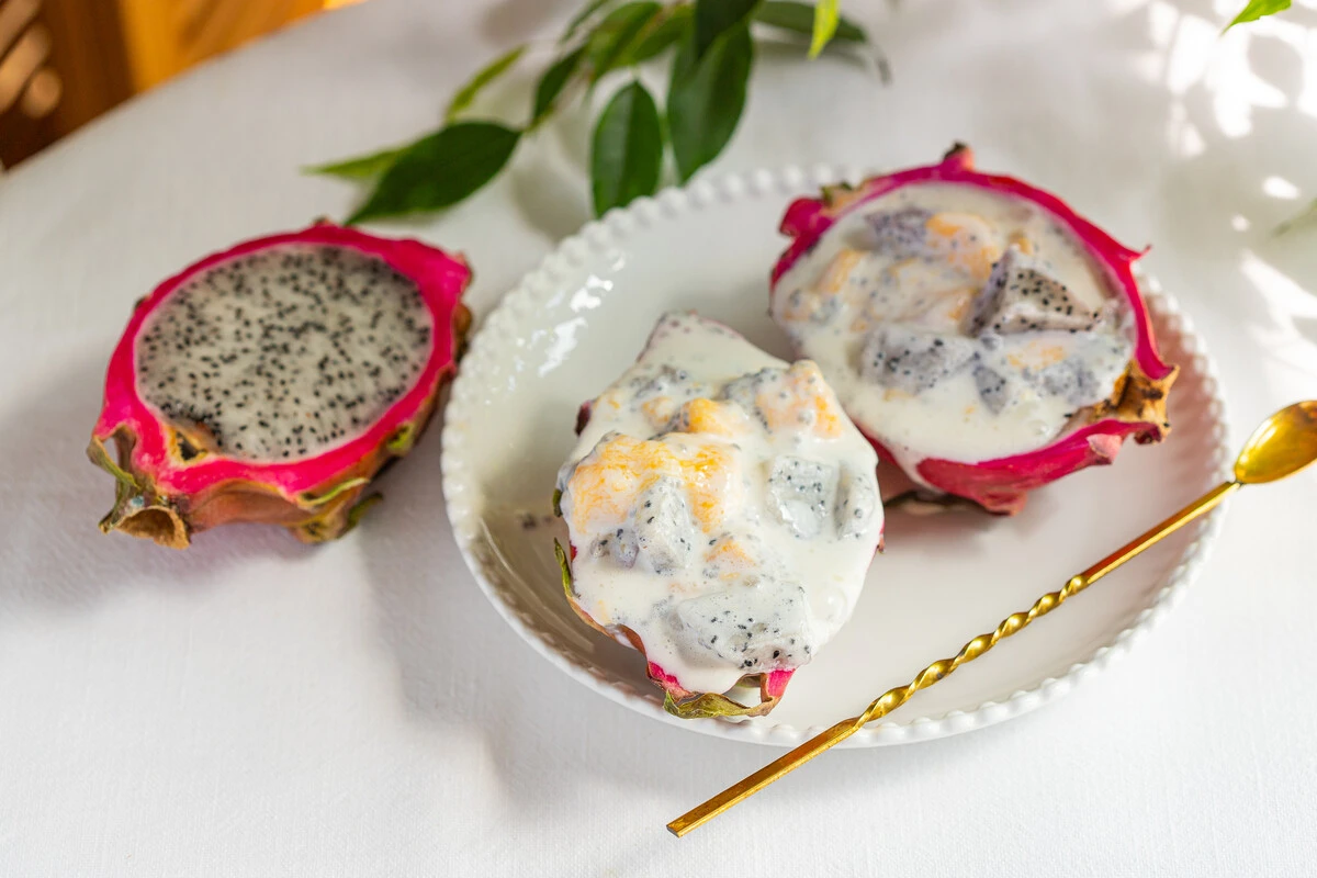 Выложите получившийся десерт в половинки кожуры питахайи или креманки и подавайте сразу же.