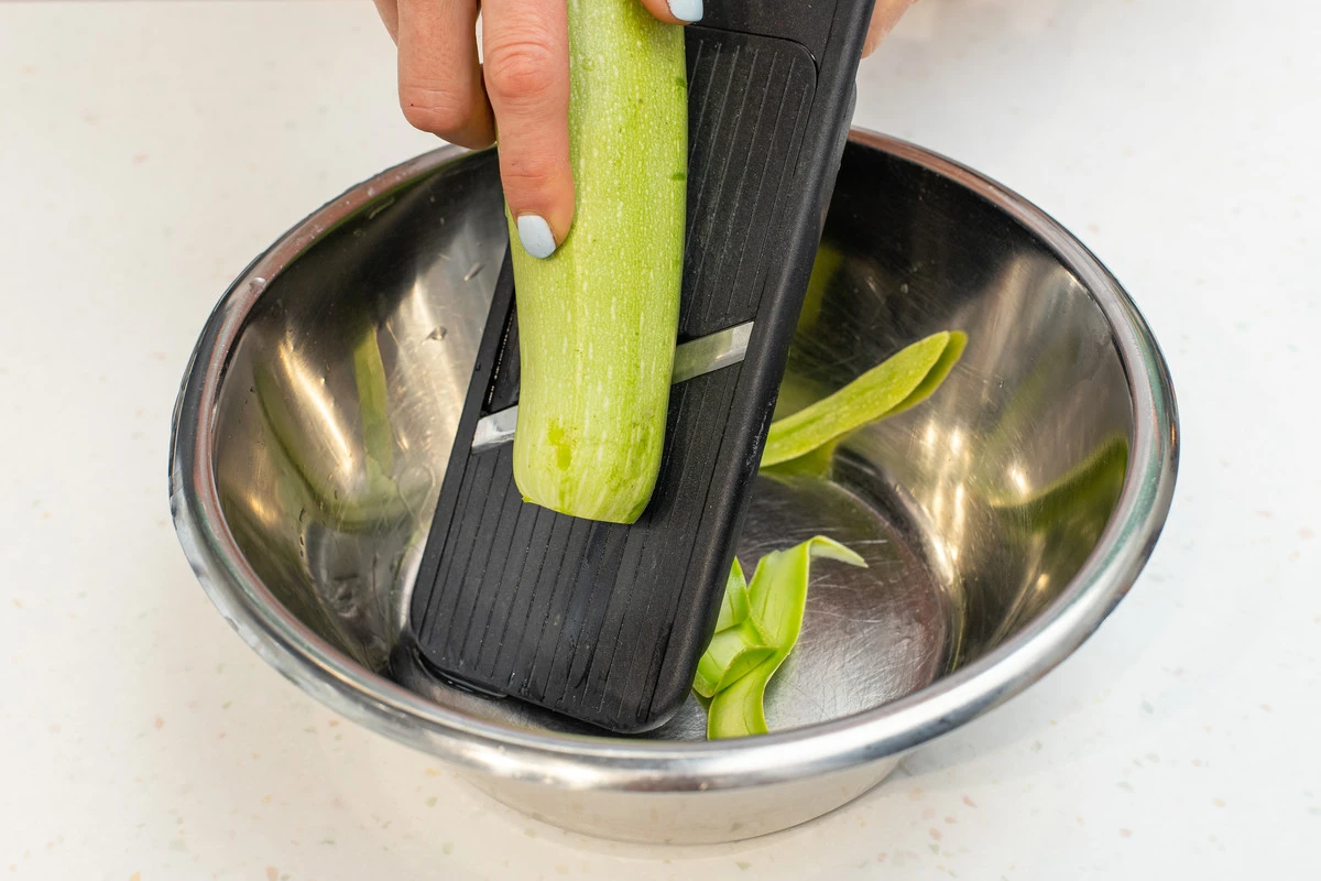Кабачок с тонкой кожицей нарежьте тонкими слайсами при помощи овощечистки, ножа или тёрки.