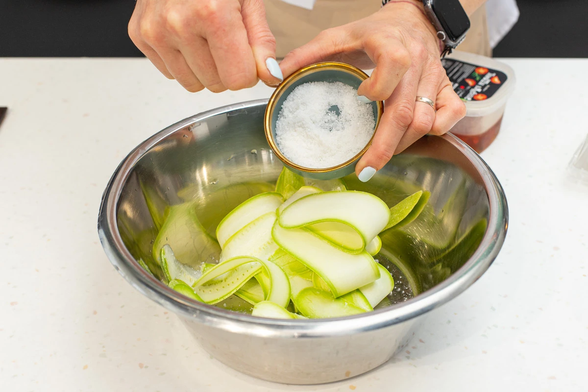 Посолите, перемешайте и оставьте на 10-15 минут. Слейте выделившийся сок.