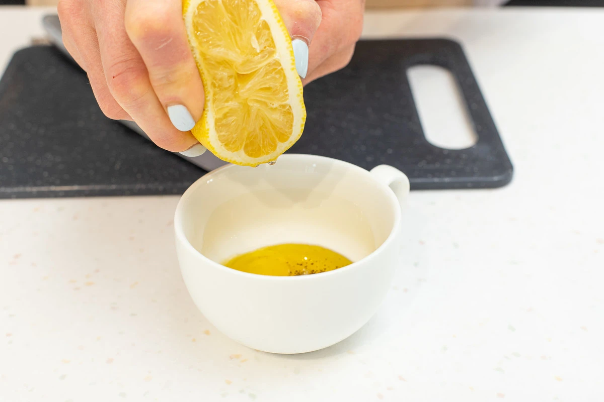 Оливковое масло взбейте с солью, перцем, мёдом и лимонным соком при помощи вилки.