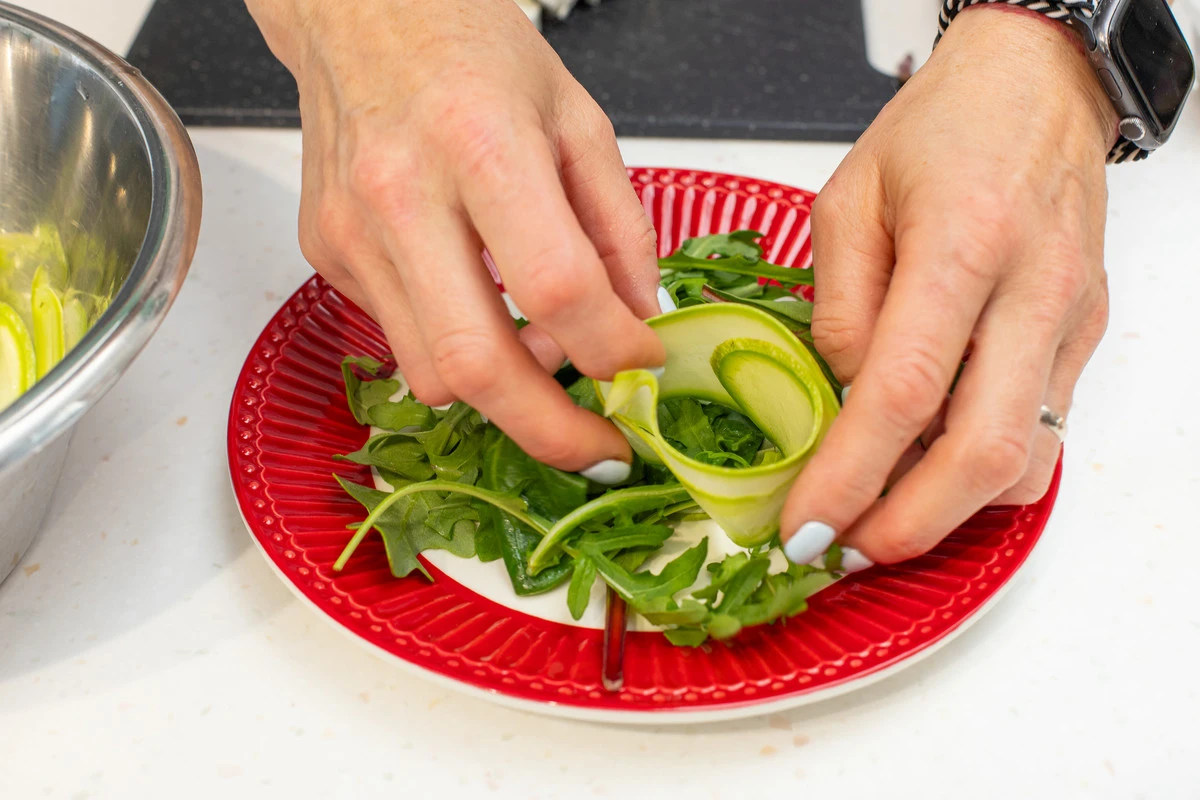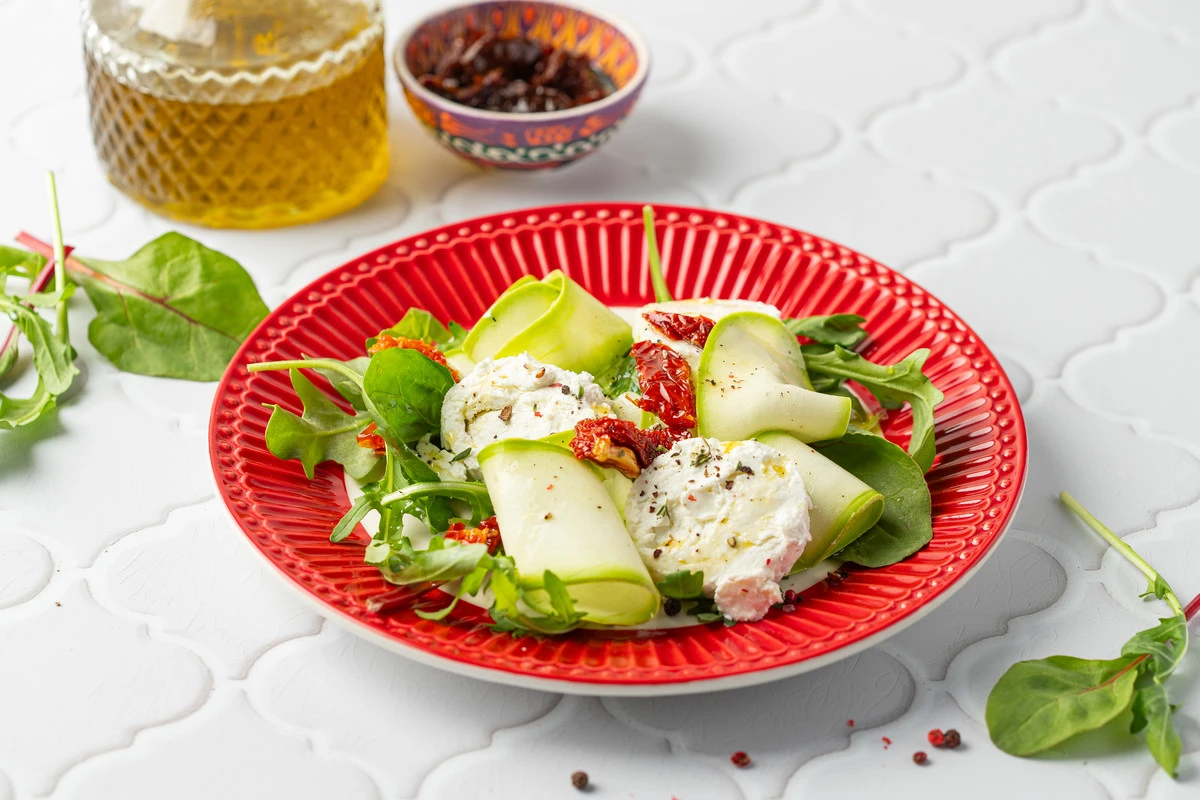 На тарелку выложите салатные листья, сверху подмаринованные кабачки, сыр и вяленые томаты.