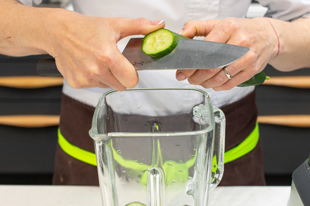 Огурец нарежьте кружочками или длинными полосками прямо в кувшин.