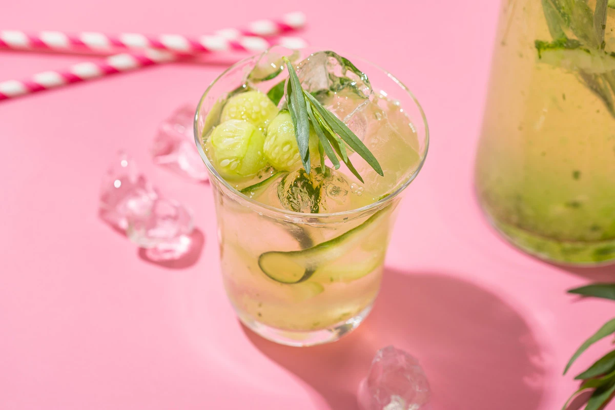 Сам по себе нейтральный огурец придаёт лимонаду особенную свежую нотку. Идеально добавить к сочетанию лимона и огурца зелень тархуна — это очень вкусно.