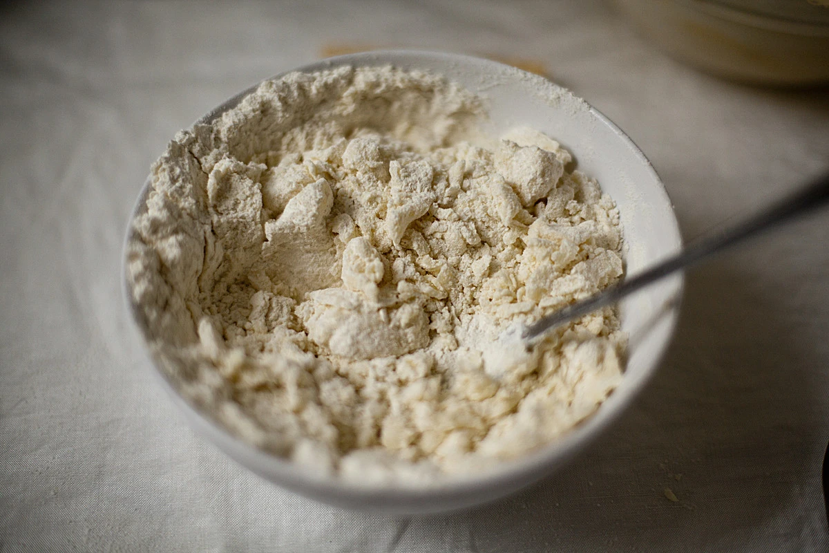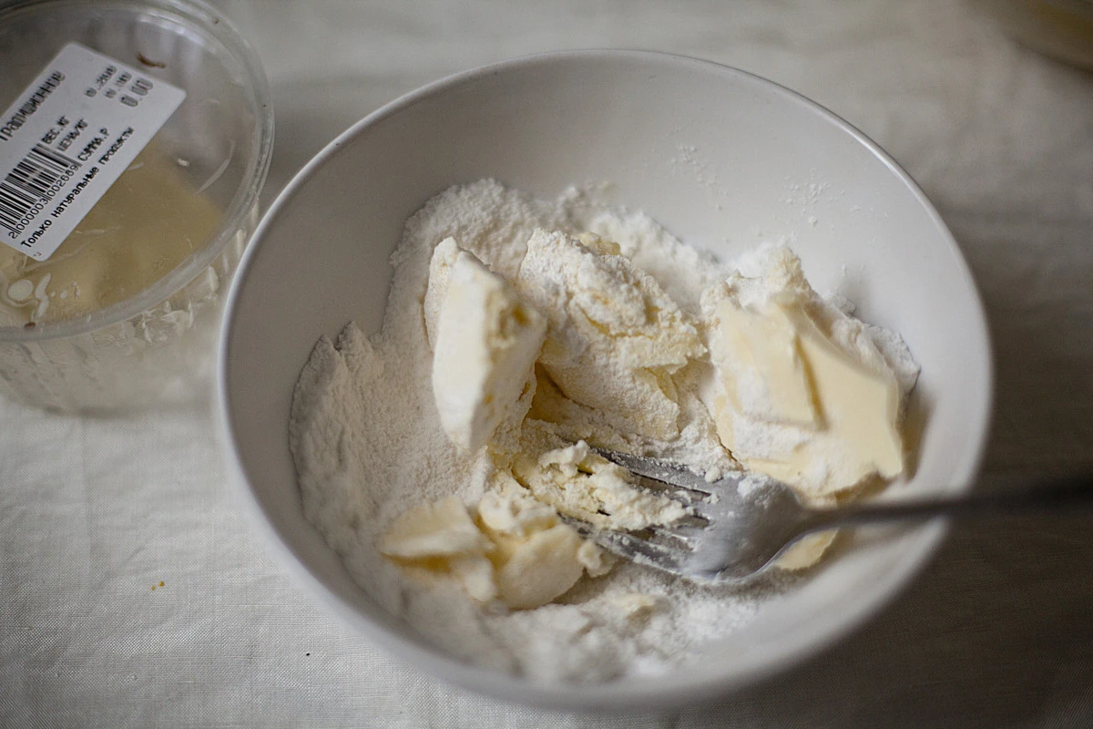Добавьте муку и месите вилкой, пока не образуется крошка.