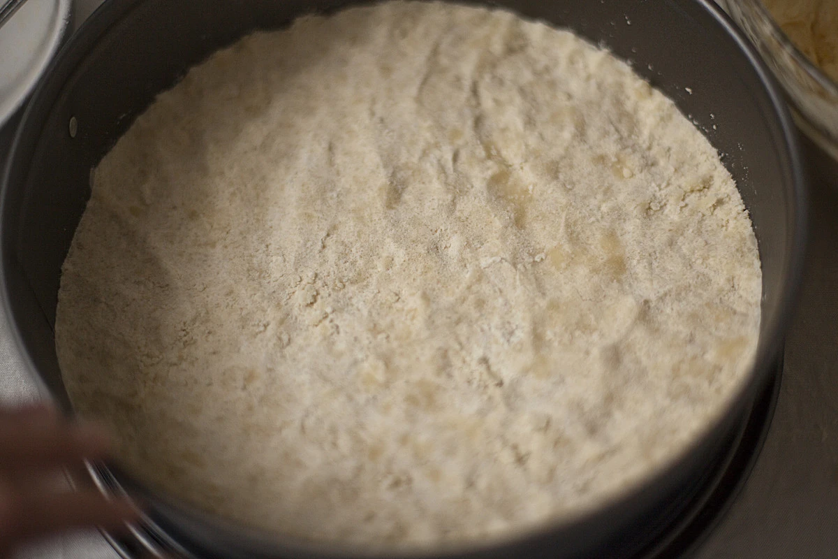 Пересыпьте крошку в форму, в которой будете делать торт, и распределите руками по дну. Для этого торта нужно использовать разъёмную форму, так как иначе его не удастся вынуть красивым и целым. Выпекайте в нагретой до 190 °C духовке 15 минут.