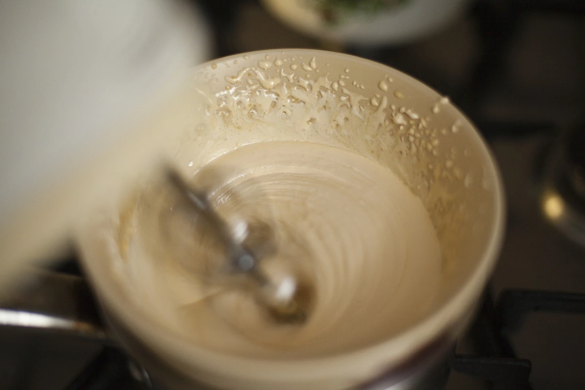 Желтки взбейте миксером с 3 ст. ложками сахара на водяной бане до образования густого белого крема. Затем переставьте ёмкость с желтками в холодную воду и взбивайте ещё минуту.