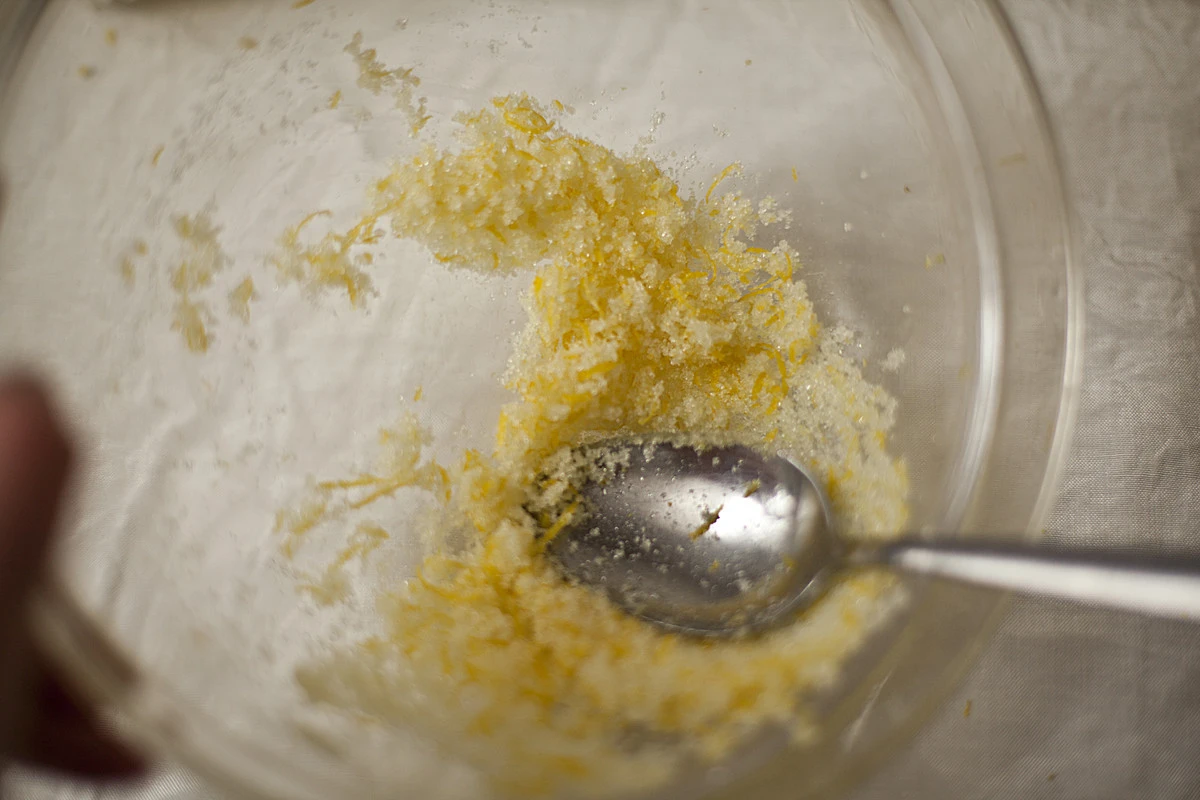 Мелкой тёркой снимите с лимона цедру и разотрите с оставшимся сахаром.