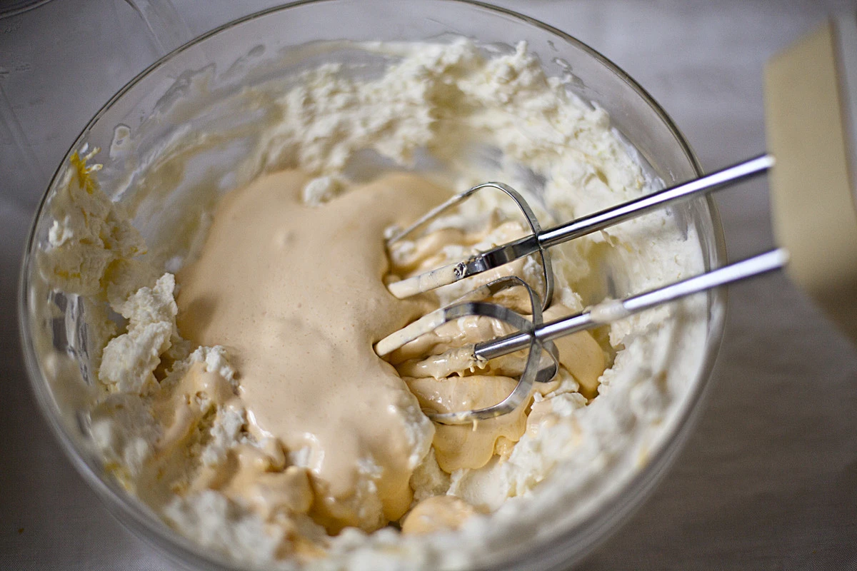 Добавьте творог, творожный крем и крем из желтков. Хорошо перемешайте миксером на небольшой скорости.