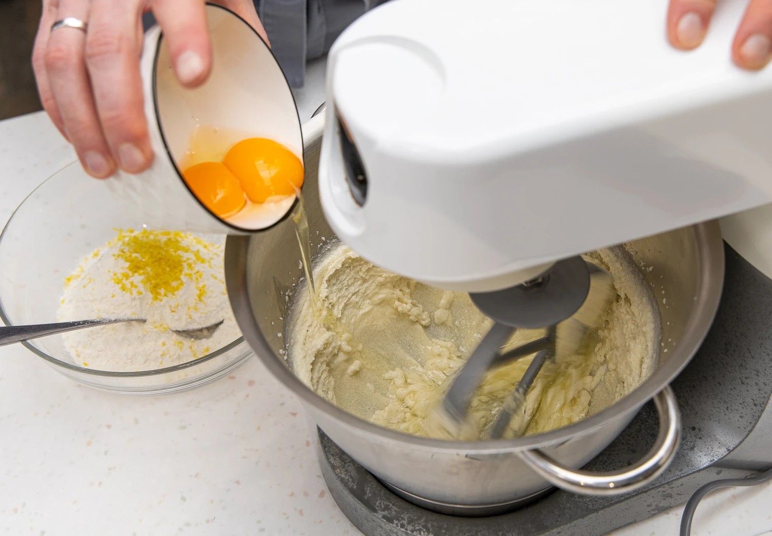 Не переставая взбивать, добавьте яйца.