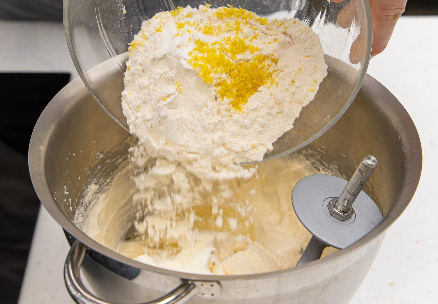 Всыпьте часть сухой смеси, перемешайте, затем добавьте сметану и лимонный сок. Перемешайте, добавьте остатки муки с цедрой и снова перемешайте.