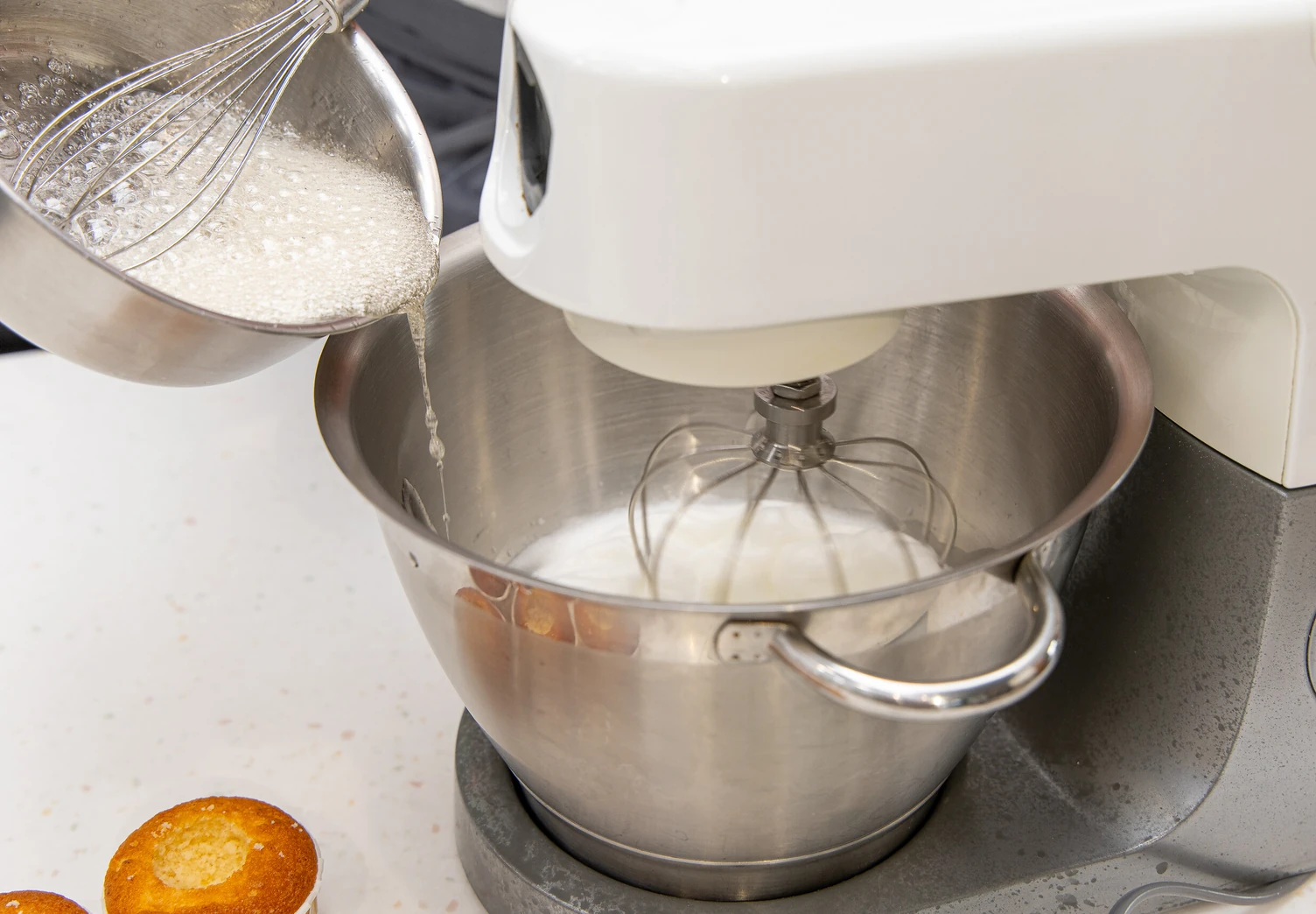Как только температура сиропа достигнет 118 °C, влейте его тоненькой струйкой по стенке чаши миксера в белки. Продолжайте взбивать меренгу до устойчивых пиков ещё около 10 минут.