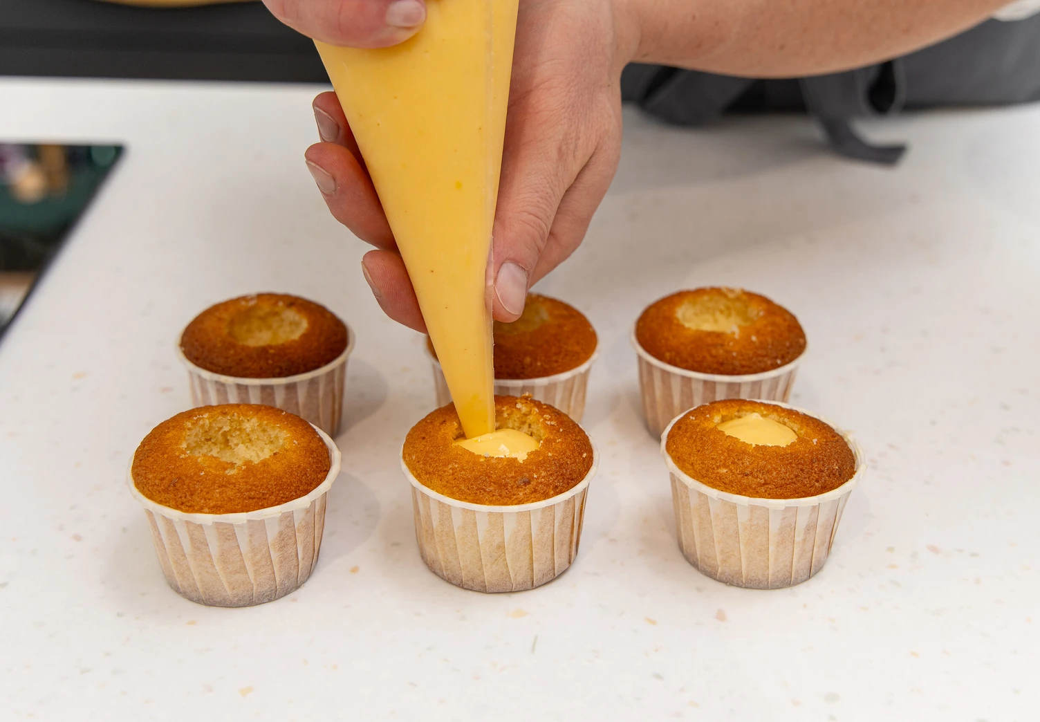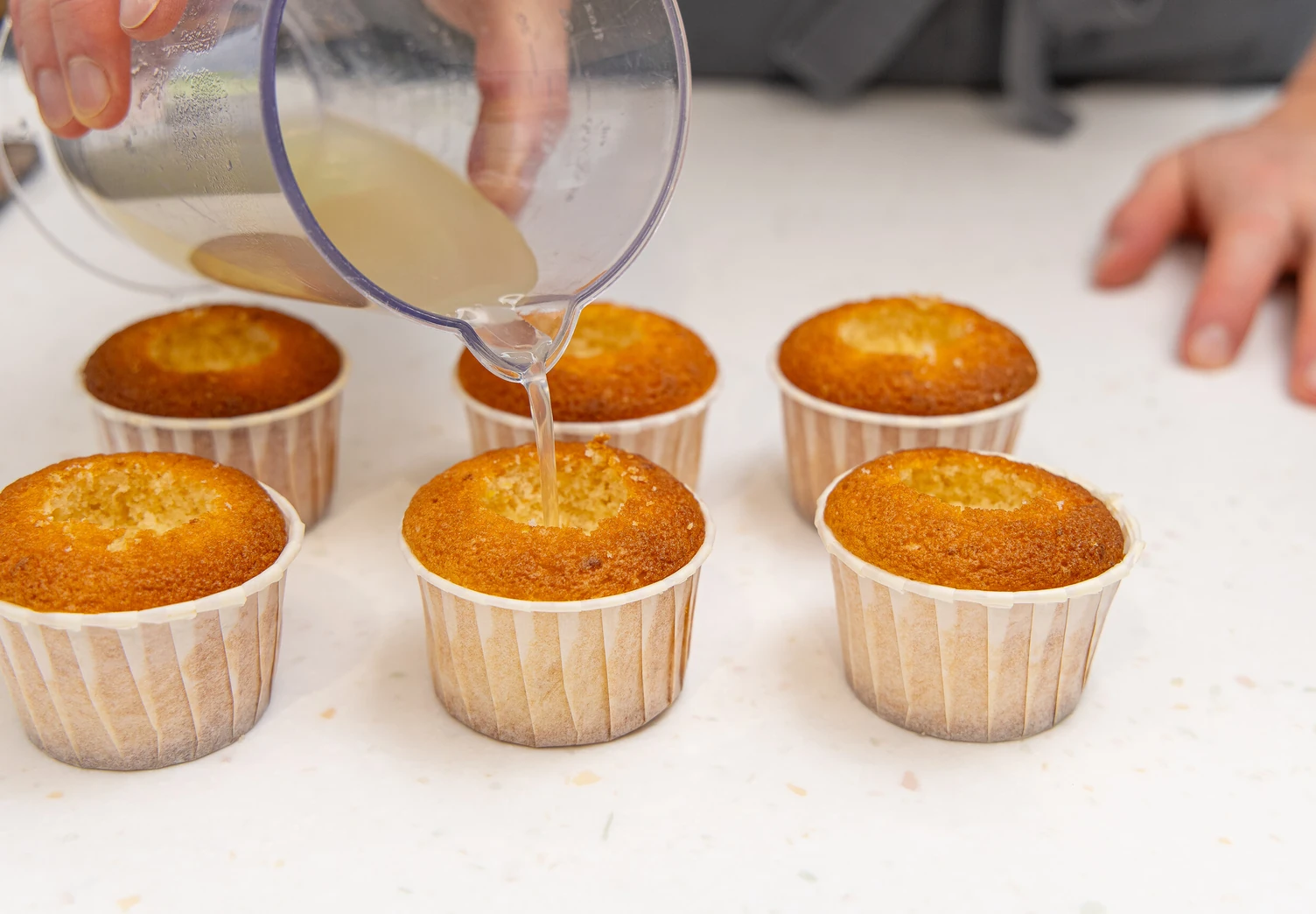 Соберите капкейки. Для этого выньте с помощью чайной ложки немного теста из центра каждого и пропитайте лимонным сиропом.