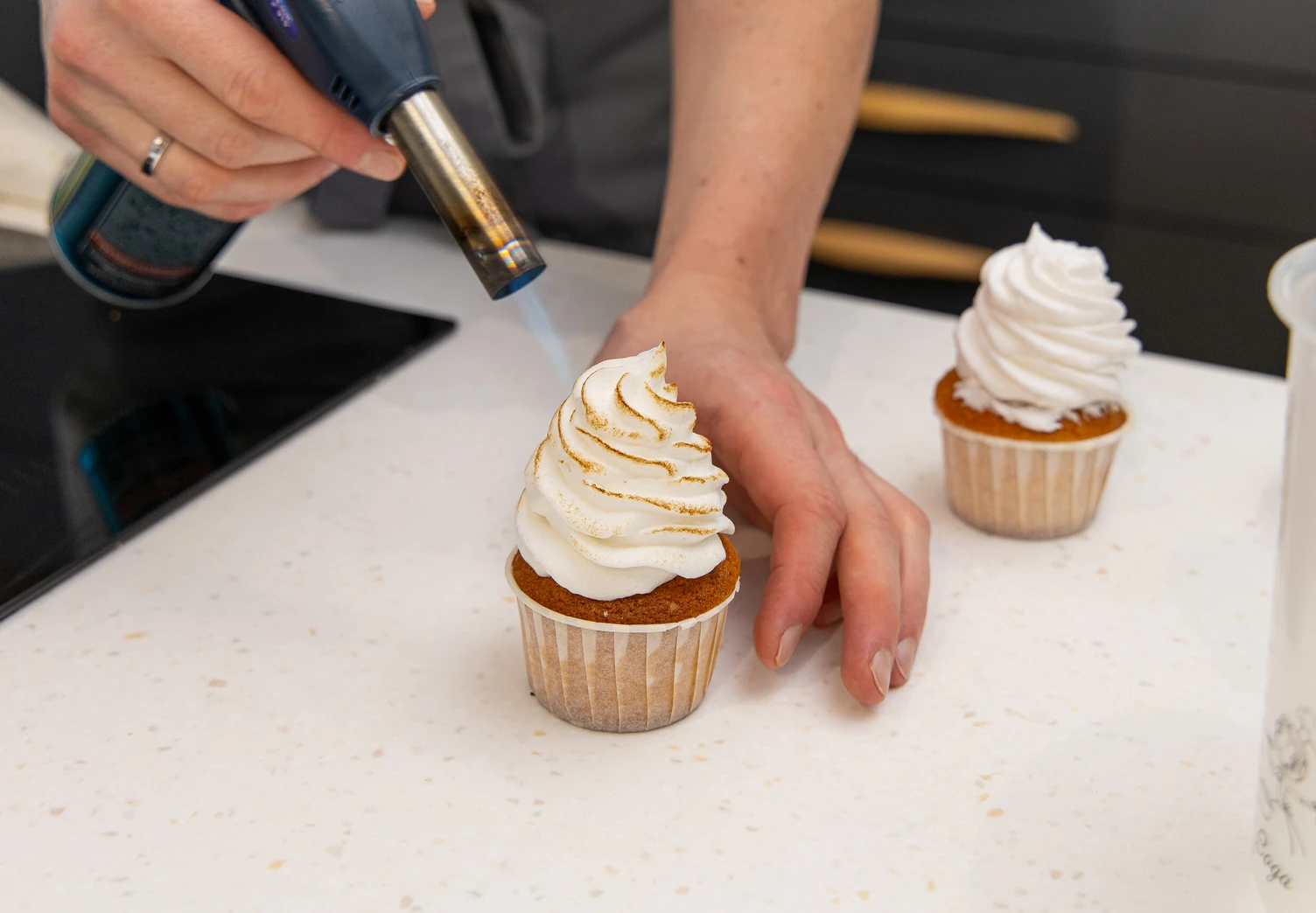 Переложите меренгу в кондитерский мешок с насадкой «звезда» и сделайте шапочки на капкейках.