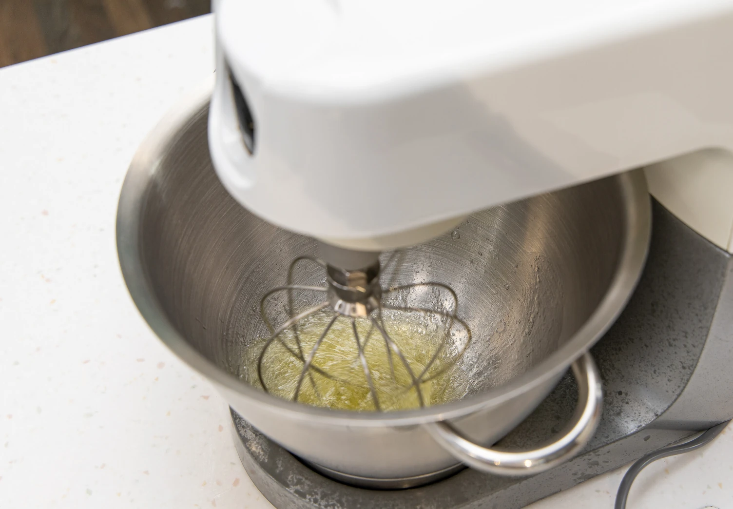 Доведите содержимое сотейника до кипения и начните взбивать белки на средней скорости.
