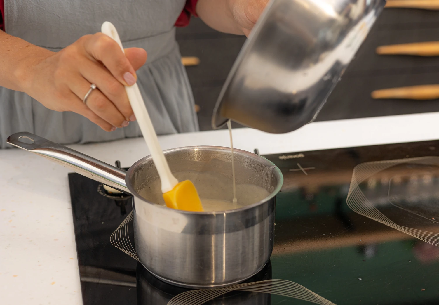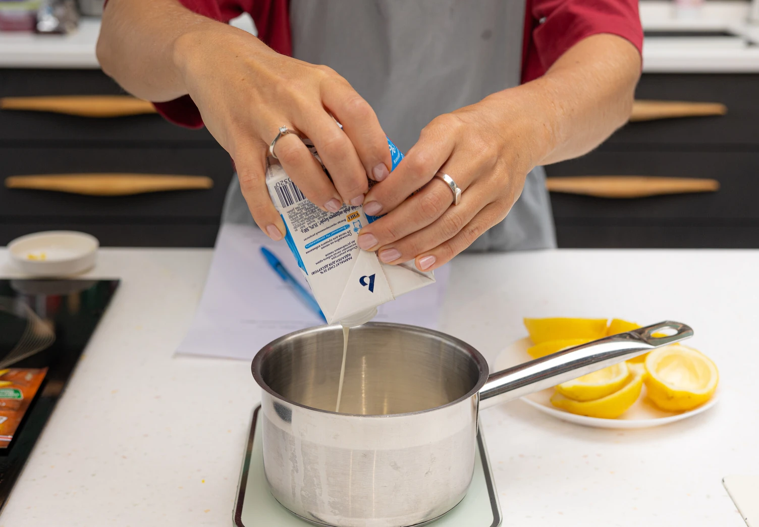 Снимите сливочную смесь с огня и влейте в неё тонкой струйкой лимонный фреш.