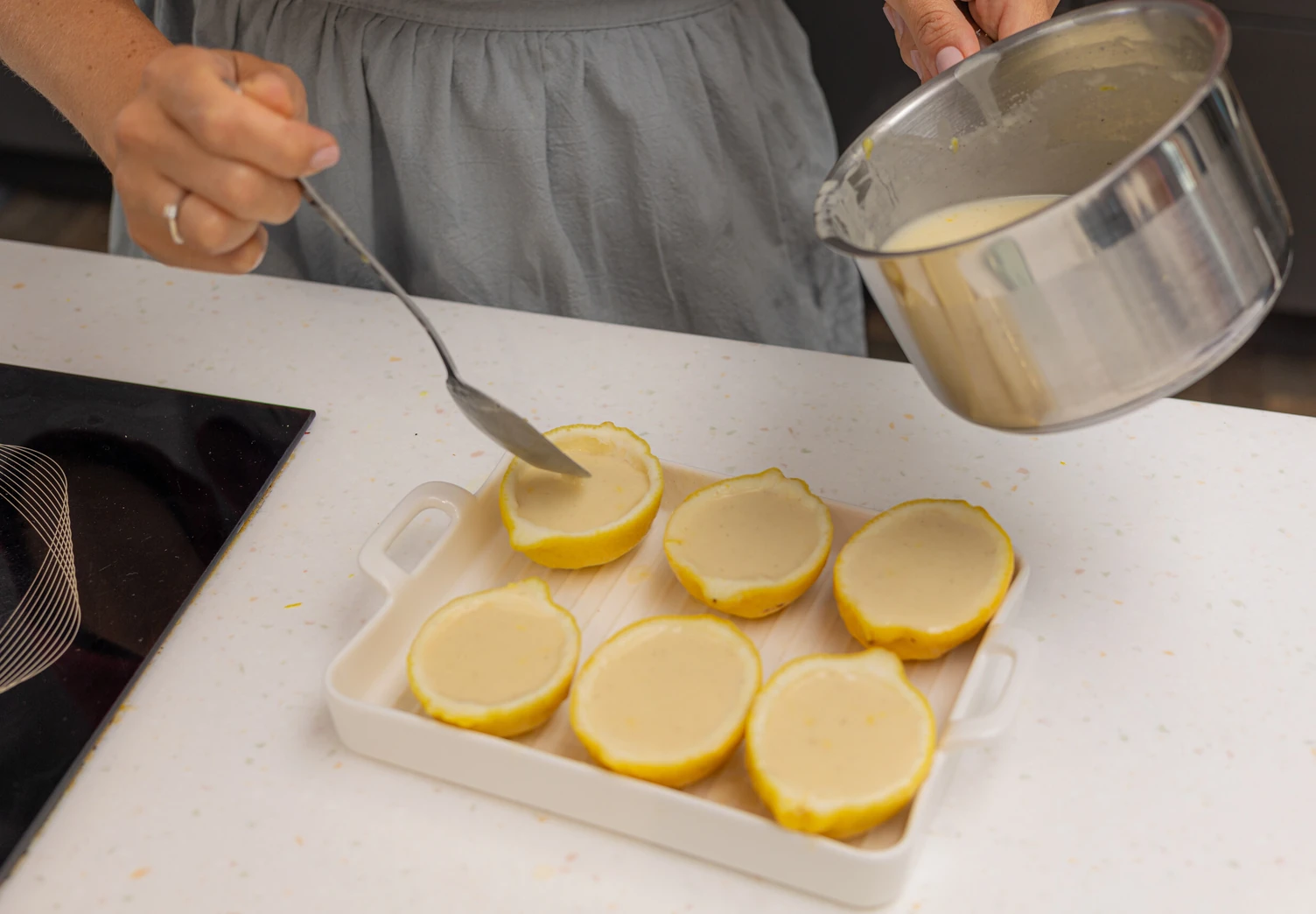 Добавьте цедру, перемешайте и разлейте смесь по лимонным половинкам. Уберите в холодильник на 2–3 часа для застывания.