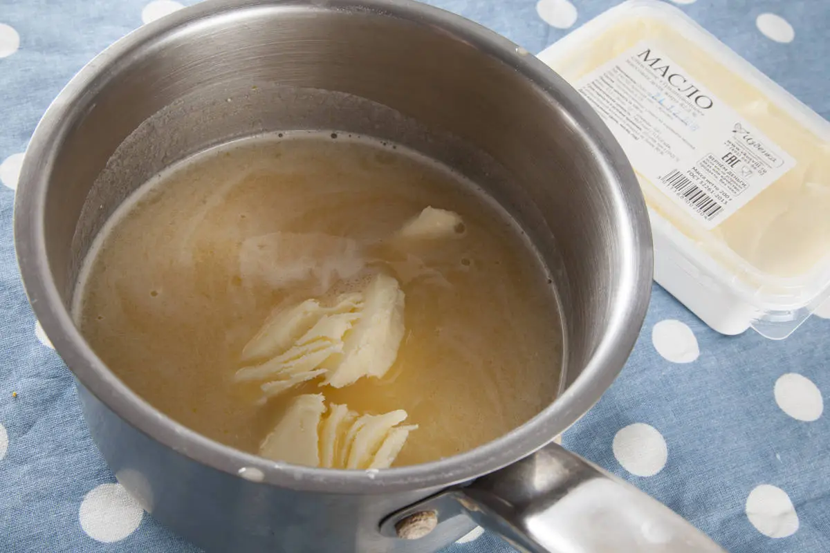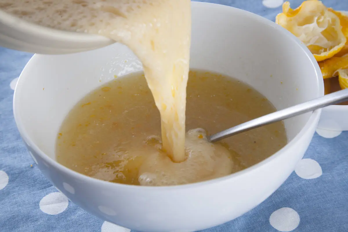 Яйца взбейте вилкой до однородности, соедините яичную смесь с лимонным соком, перемешайте, дайте постоять 10-15 минут и процедите через сито в кастрюльку.