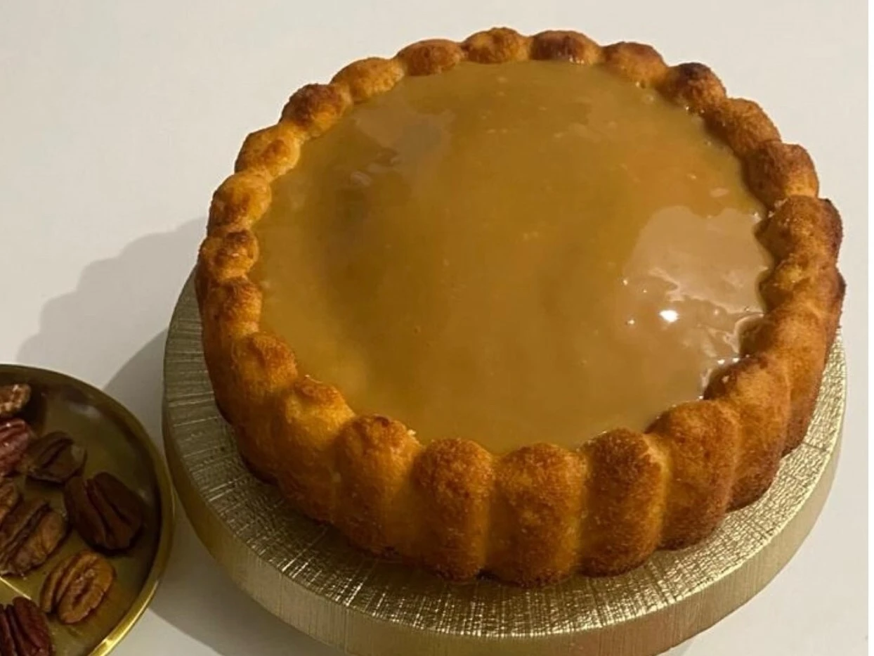 Покройте пирог карамелью, украсьте пеканом и кусочками белого шоколада.