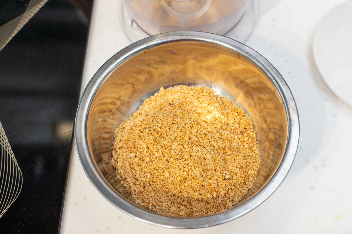 Добавить размягченное масло и перемешать до состояния крошки. Добавить яйцо и молотый фундук.