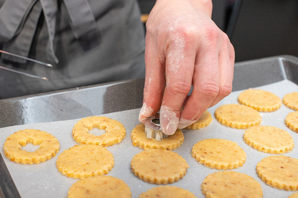 На присыпанной мукой поверхности раскатать тесто толщиной 6 мм. Вырезать печенья при помощи формы диаметром около 7 см. Выложить на противень, застеленный пергаментом. У половины печений вырезать дырочки в центре при помощи меньших формочек.